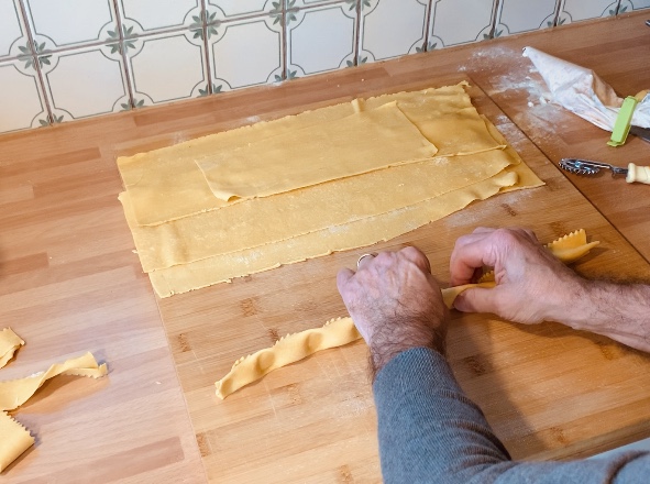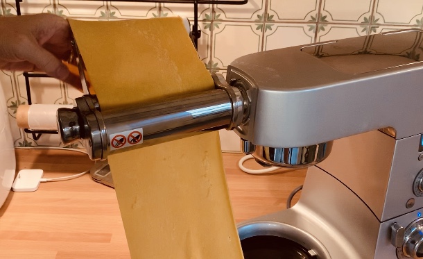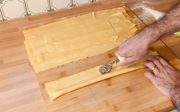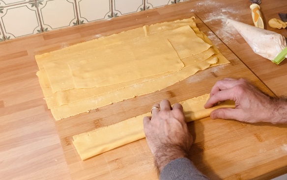 poi senza farlo risposare, tagliarlo a fette, creare un quadrato con 4 fette e passarlo nel rullo creando una sfoglia stretta e fine.