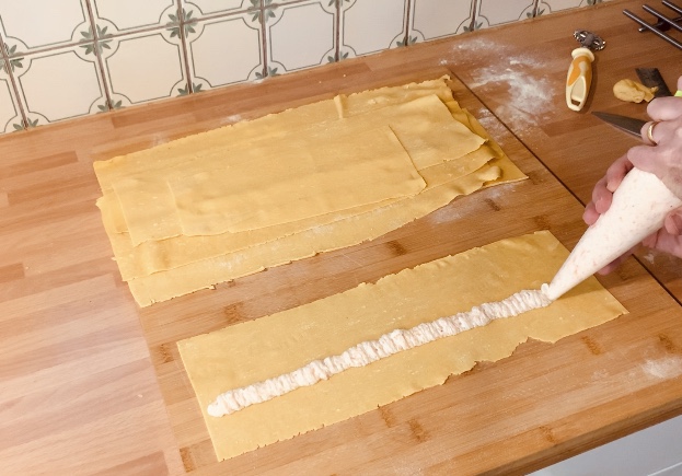 Con il sac a poche formare al centro della sfoglia un filoncino di ripieno, chiudere la sfoglia e cercare di levare più aria possibile con le dita vicino al ripieno,