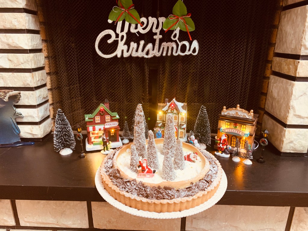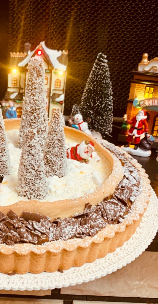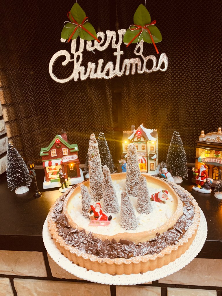 Una fantasiosa e gustosa Crostata di Natale, senza glutine, che replica un giardino invernale con i pini, dei coni gelato senza glutine, coperti di neve del cocco essiccato, su un prato innevato, una soffice Panna Cotta preparata con l’Agar Agar, con un contorno di terra brulla fatta di crema di mele e cioccolato: una ricetta di Montersino, tratta dalla collezione di Creme per Bimby, il tutto su una frolla priva di glutine, una ricetta già più volte utilizzata per le mie torte vedi la “Crostata Frangipane Yin e Yang…“