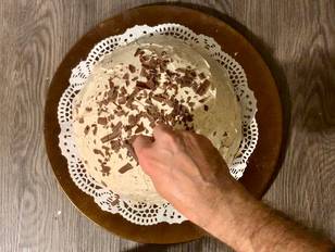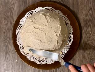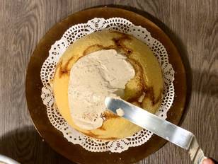 Altrimenti proseguiamo… io gli ho spatolato su tutta la superficie, tranne la base, il resto della crema Tiramisù con cioccolato.
