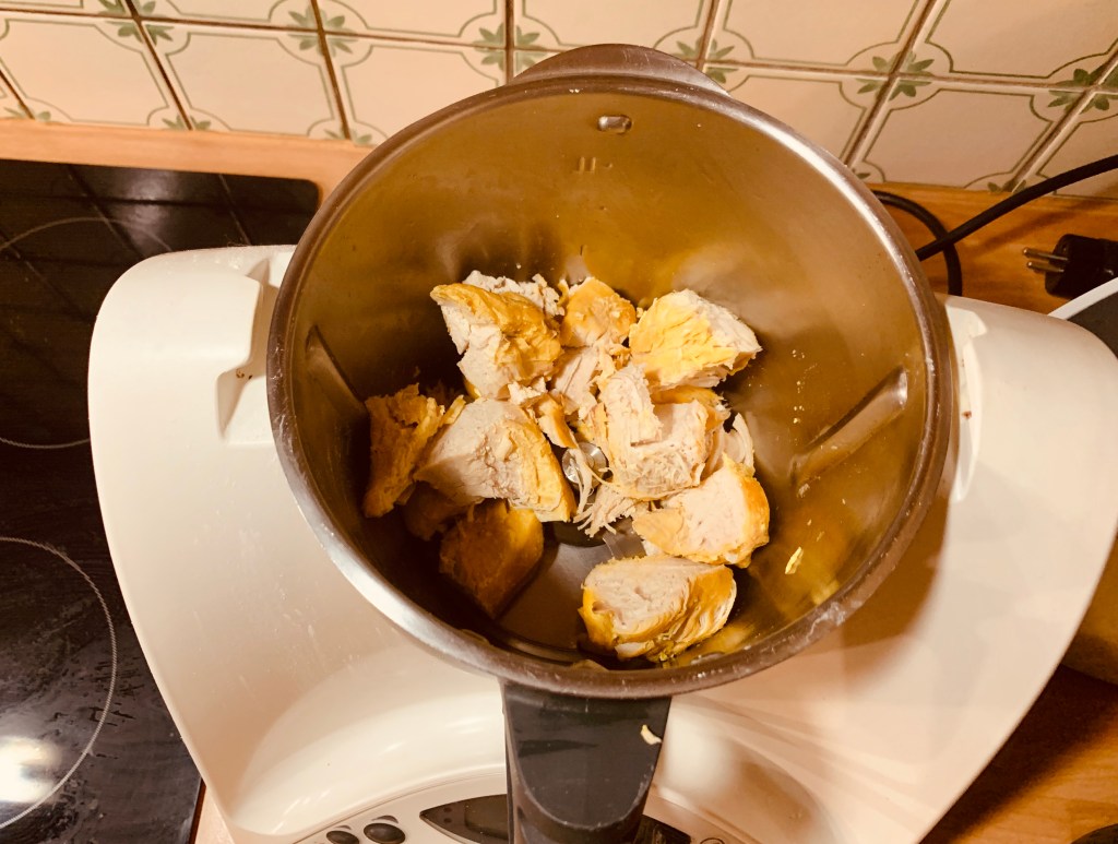 Sfilacciare il petto di pollo con una forchetta, o come ho fatto io mettendolo a pezzetti nel bimby e fatto girare a velocità 5 per 5 secondi.