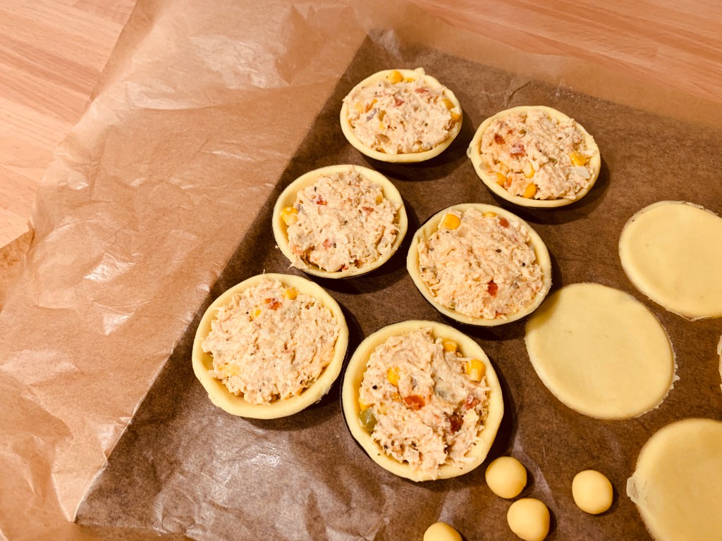 Riprendere le formine foderate di pasta frolla e riempirle del ripieno di pollo ormai raffreddato.