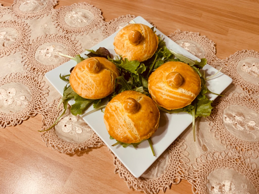 Stendere l’impasto tra due fogli di carta forno e coppare 24 dischetti da cm. 7,5, 12 verranno utilizzati per foderare delle formine della stessa misura ed alte 2 cm, 12 dischetti serviranno per chiudere a tappo i tortini ripieni.
