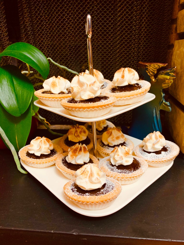 Ho fatto rapprendere un po’ la ganache e poi gli ho “collato” una meringhetta, preparate qualche giorno prima, le ho fiammeggiate con il cannello e finalizzate con una spolverata di zucchero a velo.