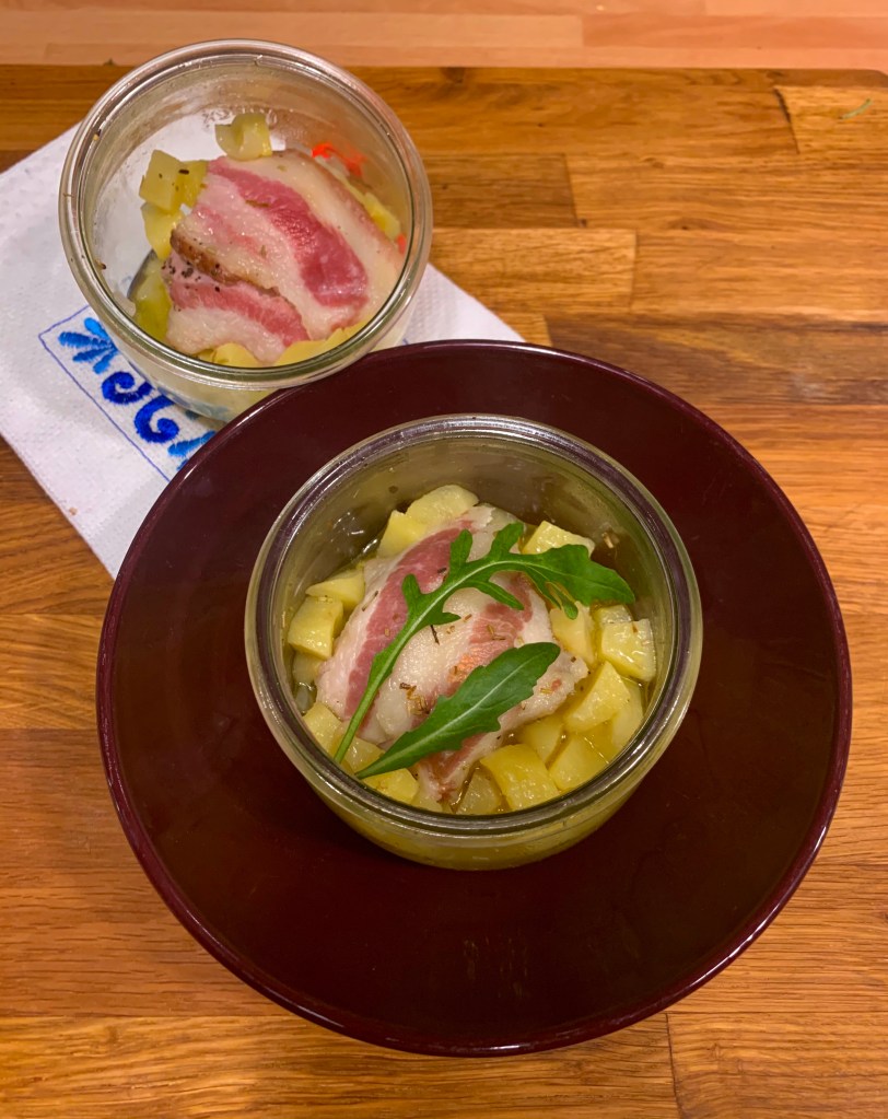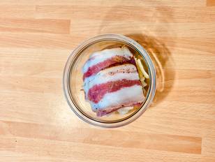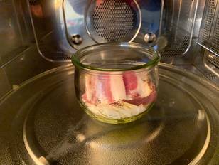 Tagliare a dadini la cipolla e versarla nel vasetto weck da 500 ml con il cucchiaio di olio, soffriggere al microonde senza tappo a 750 watt per 2 minuti, aggiunfere il filetto coperto dalle due fettine di guanciale e rimettere il vasetto nel microonde sempre senza tappo per 1 minuto a 750 watt.