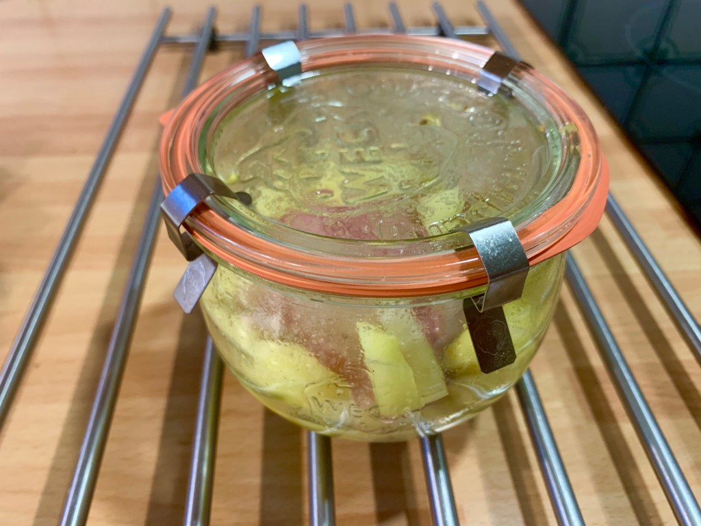 Lasciar riposare il vasetto per 20 minuti, si completerà in questo modo la cottura e si creerà il sottovuoto che permetterà di conservare la pietanza in frigo fino ad una settimana