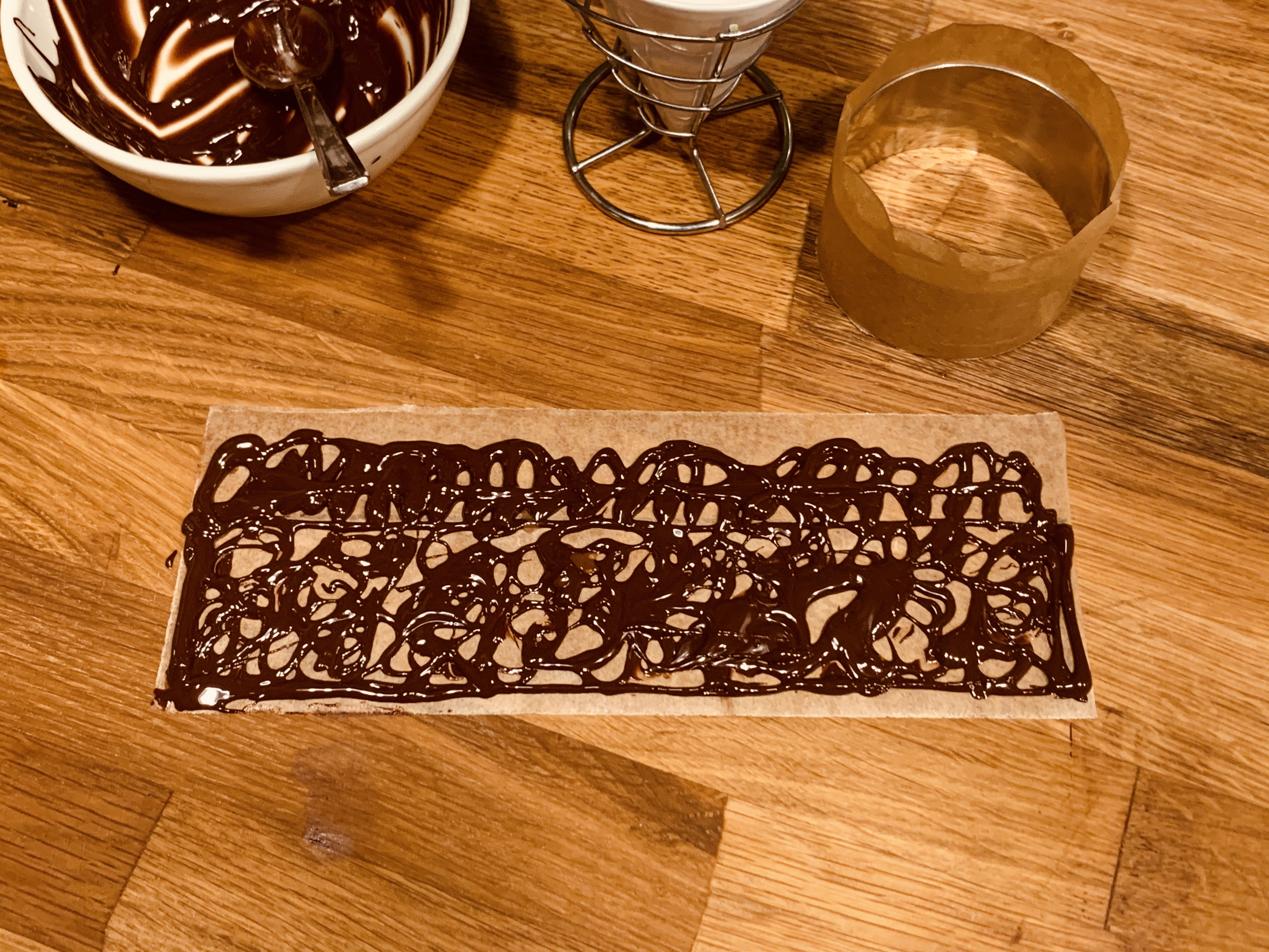 Riempire 4 formine di silicone delle dimensioni di 4cm per 7 cm o anelli di acciaio di misura simile, ma foderati con carta forno o fogli di acetato, terminare con un disco di biscotto Sacher e porli in congelatore per almeno 3 ore, meglio un giorno per l’altro