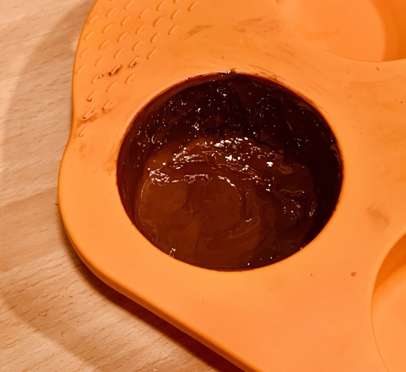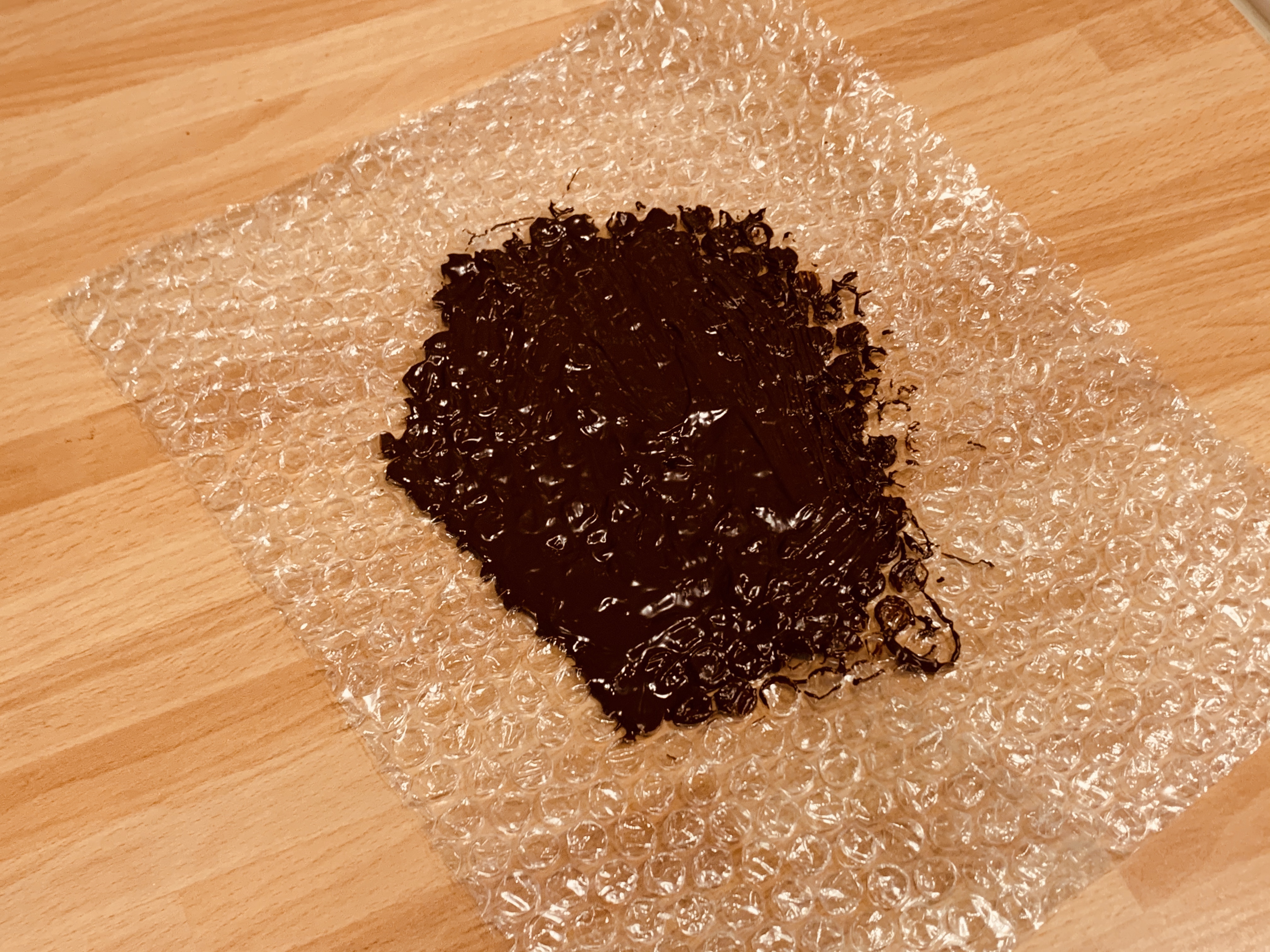Per L’ultimo tortino ho spennellato con del cioccolato fuso del pluriball, che ho messo in frigo a rassodare per 15 minuti, l’ho spezzato a scaglie e infilzato la superficie