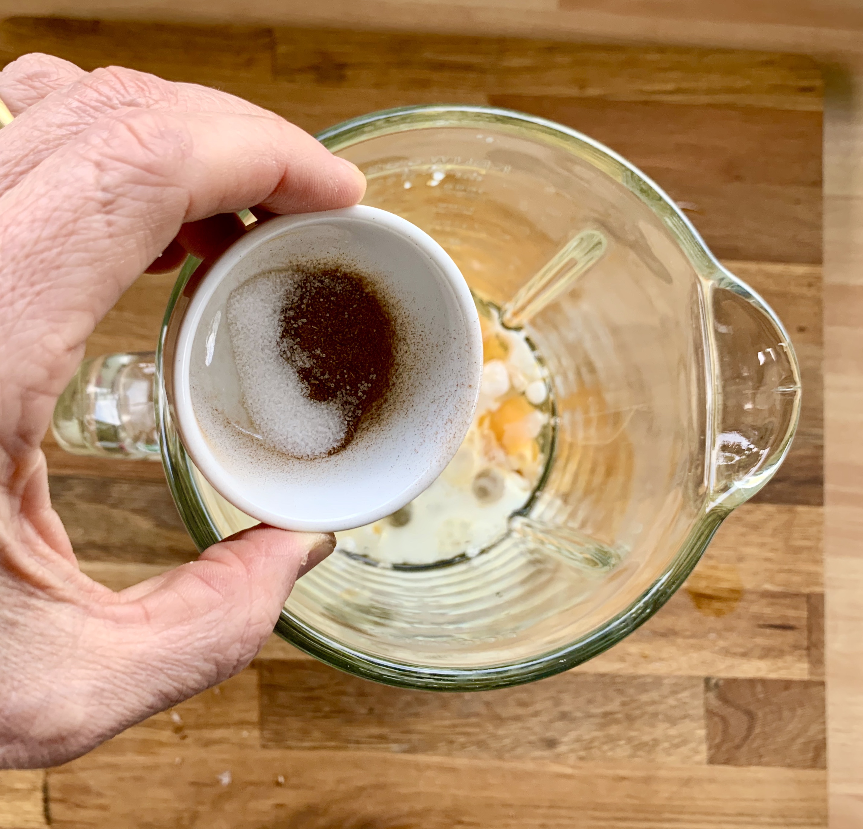 Ho unito nel boccale tutti gli ingredienti umidi pertanto: il Topinambur a pezzetti, le uova, l’olio, il latte di cocco, lo zucchero, l’aceto, il sale e la cannella.