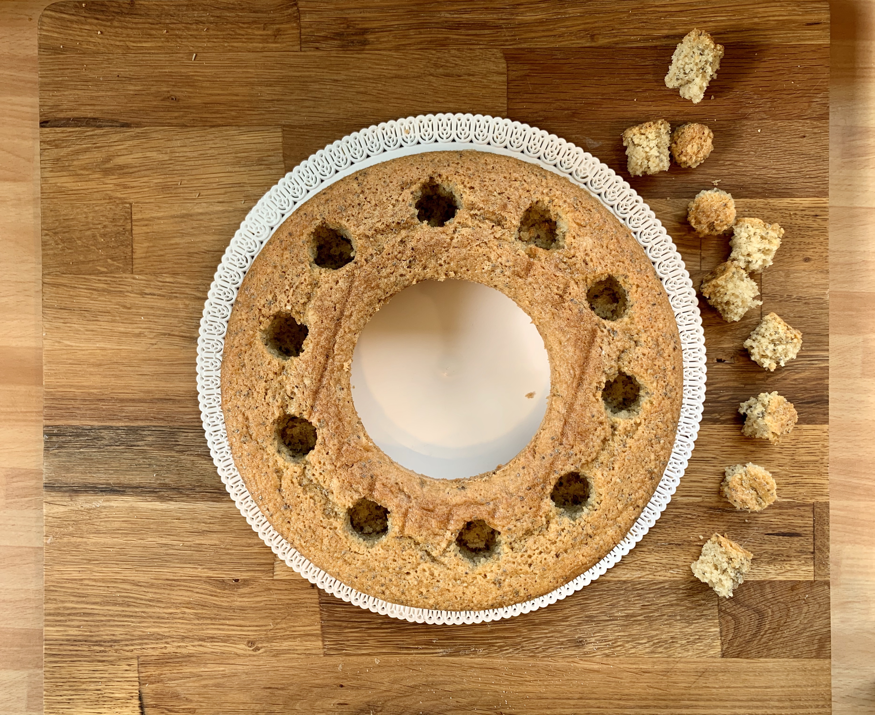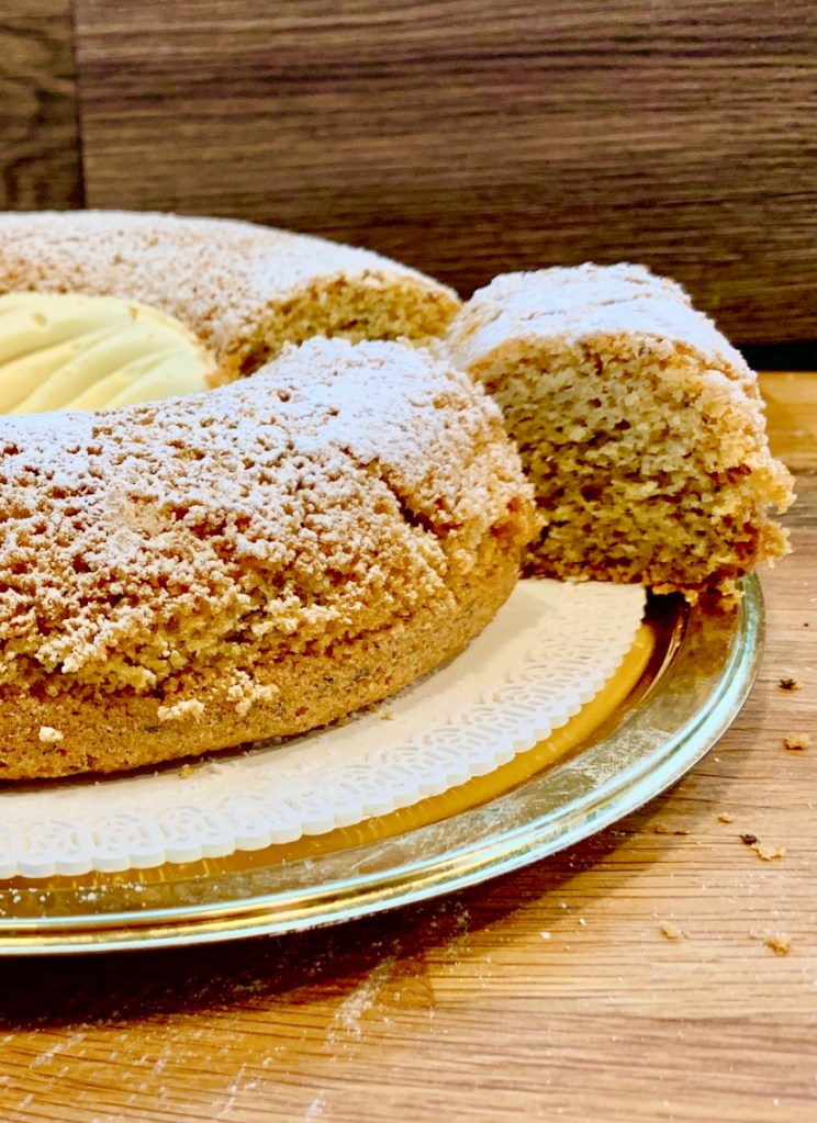 Una Ciambella senza glutine con Topinambur e Namelaka di cioccolato bianco e Topinambur.