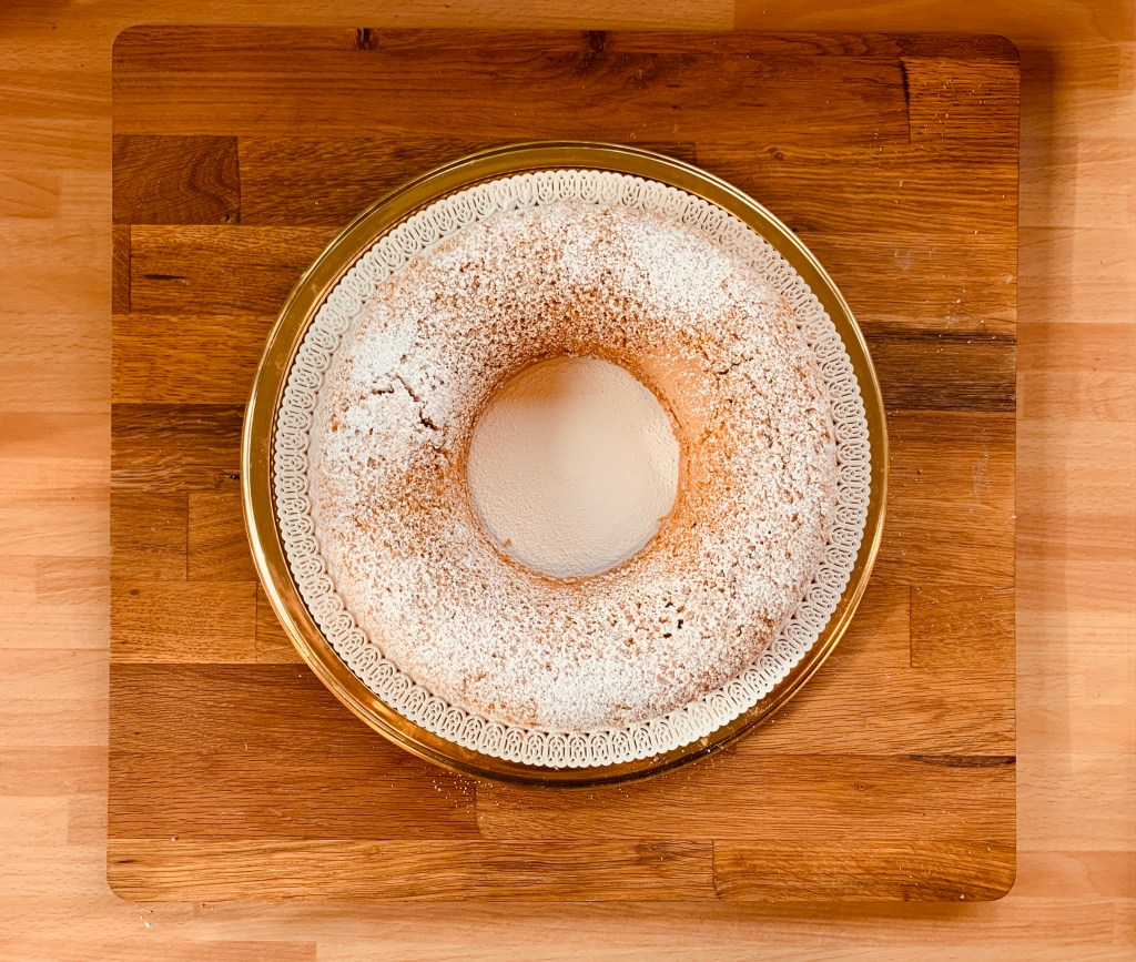 Ho girato la Ciambella su un piatto di portata e spolverizzato con dello zucchero a velo.