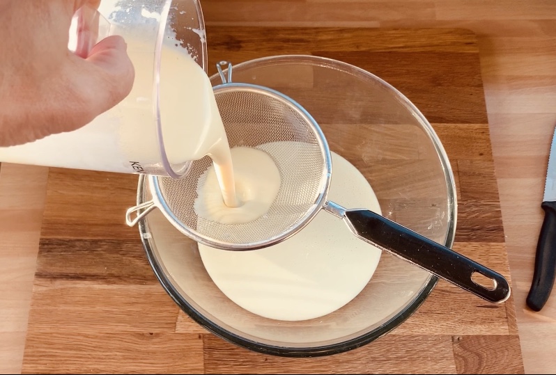 ho aggiunto la gelatina pre idratata e il cioccolato bianco fuso, ho frullato fino ad incorporare gli ingredienti. Infine ho unito la panna fredda ed ancora frullato per un paio di minuti, ho filtrato la crema in una bulle, l’ho coperta con della pellicola a contatto e messa in frigo per 12 ore.