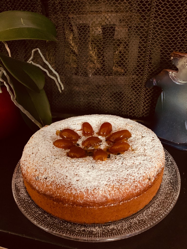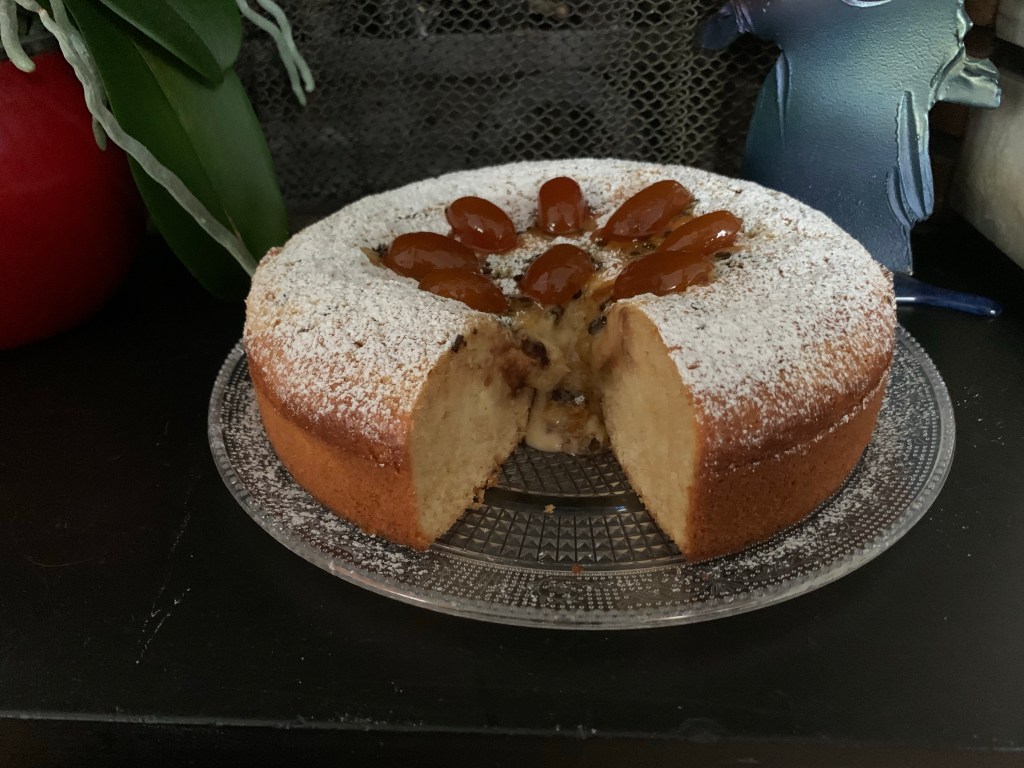 Ho scelto come ricetta una Torta Nua con Crema Pasticciera all’ananas e gocce di cioccolato; decorandola semplicemente con dei kumquats canditi e zucchero a velo.
