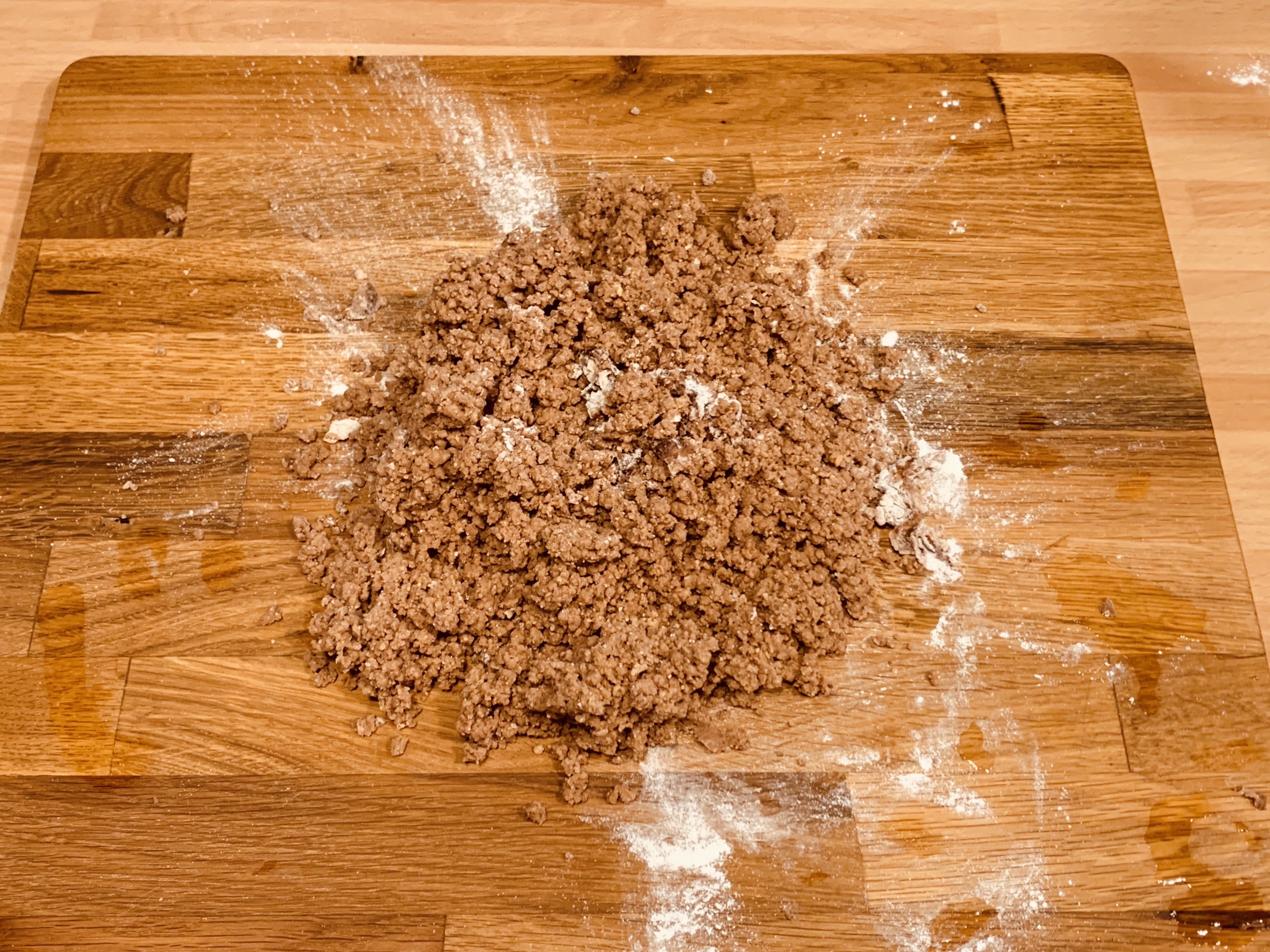 Compattare l’impasto, formare una palla, coprirla con della pellicola alimentare e far riposare in frigo per almeno 2 ore.