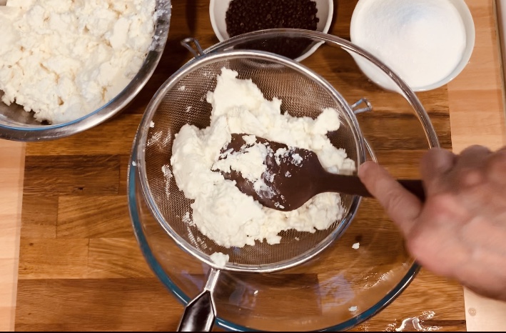 Nel frattempo prepariamo il ripieno di ricotta di pecora, che è stata messa a colare per una notte in frigo in un colapasta ed una ciotola.
