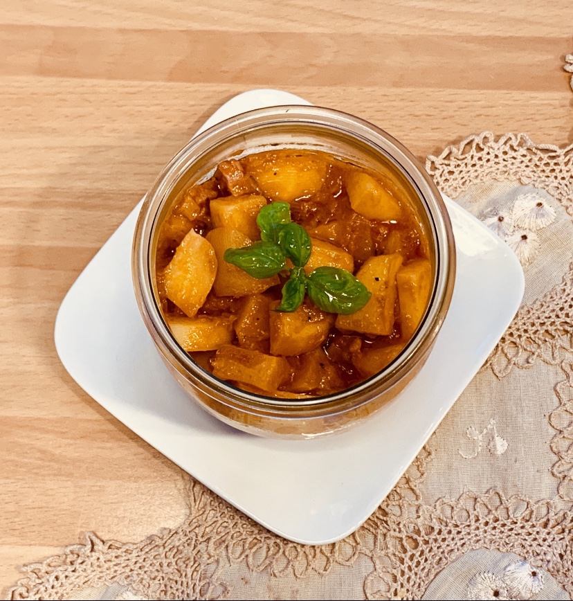 Per degustare Le Patate all’amatriciana basta rimuovere i gancetti, mettere il vasetto nel microonde per 2/3 minuti a 750 watt.