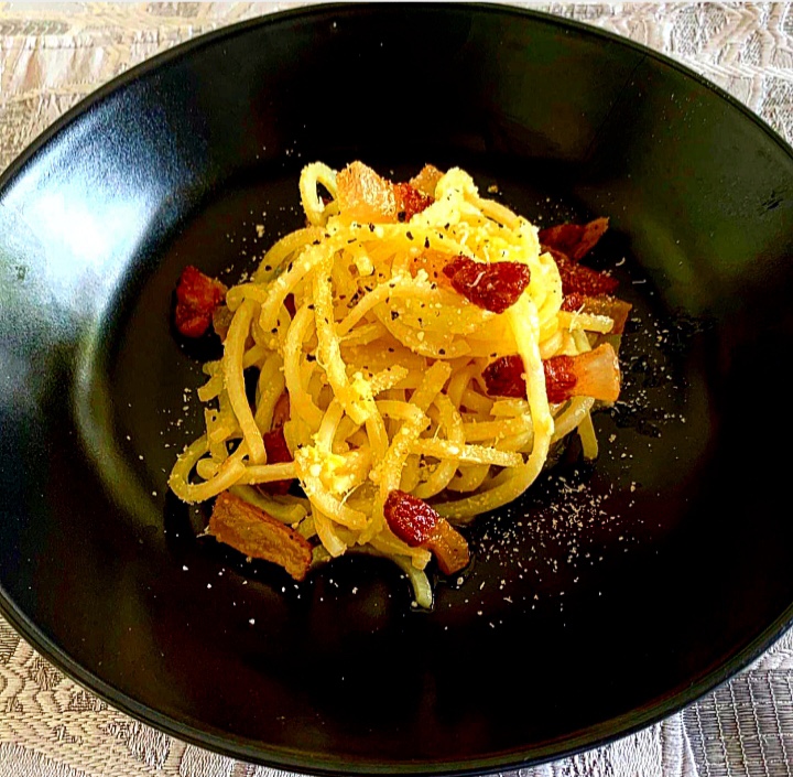 Ho unito, infine, il guanciale croccante e impiattato, finalizzando la Carbonara di Spaghetti di Patate con una spolverata di pecorino e una grattata di pepe di mulinello.
