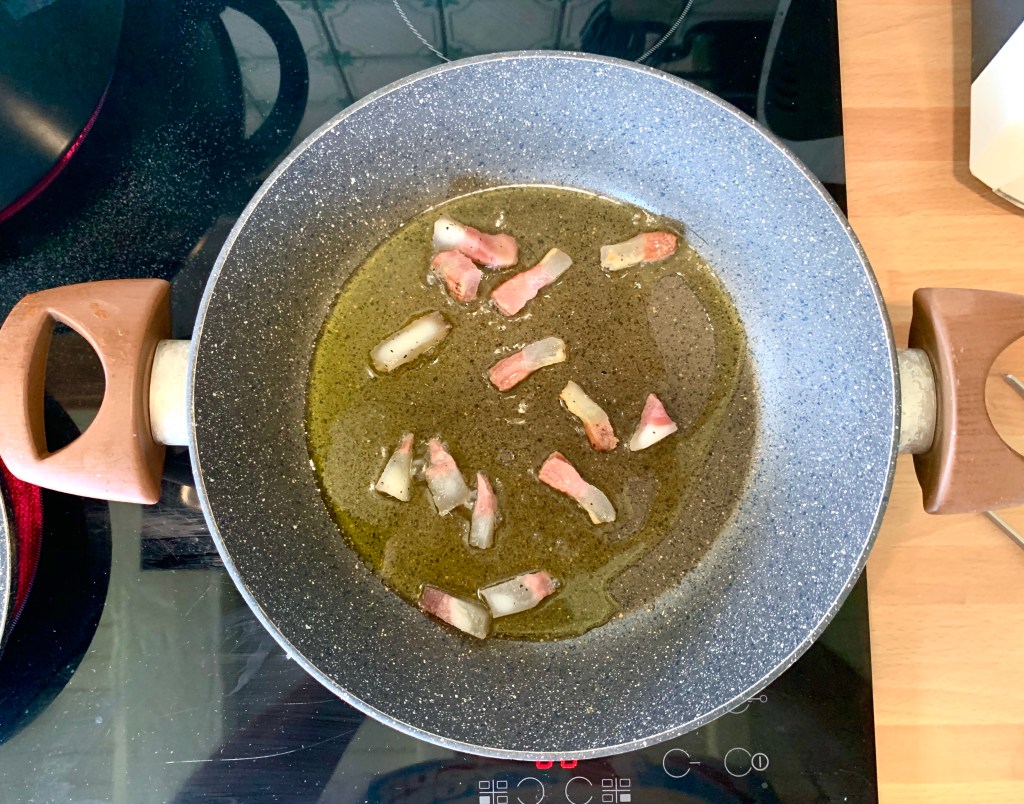 Nel frattempo ho tagliato a dadini il guanciale e l’ho reso croccante in padella con dell’olio che poi utilizzerò per risottare gli spaghetti di patate e l’ho messo da parte