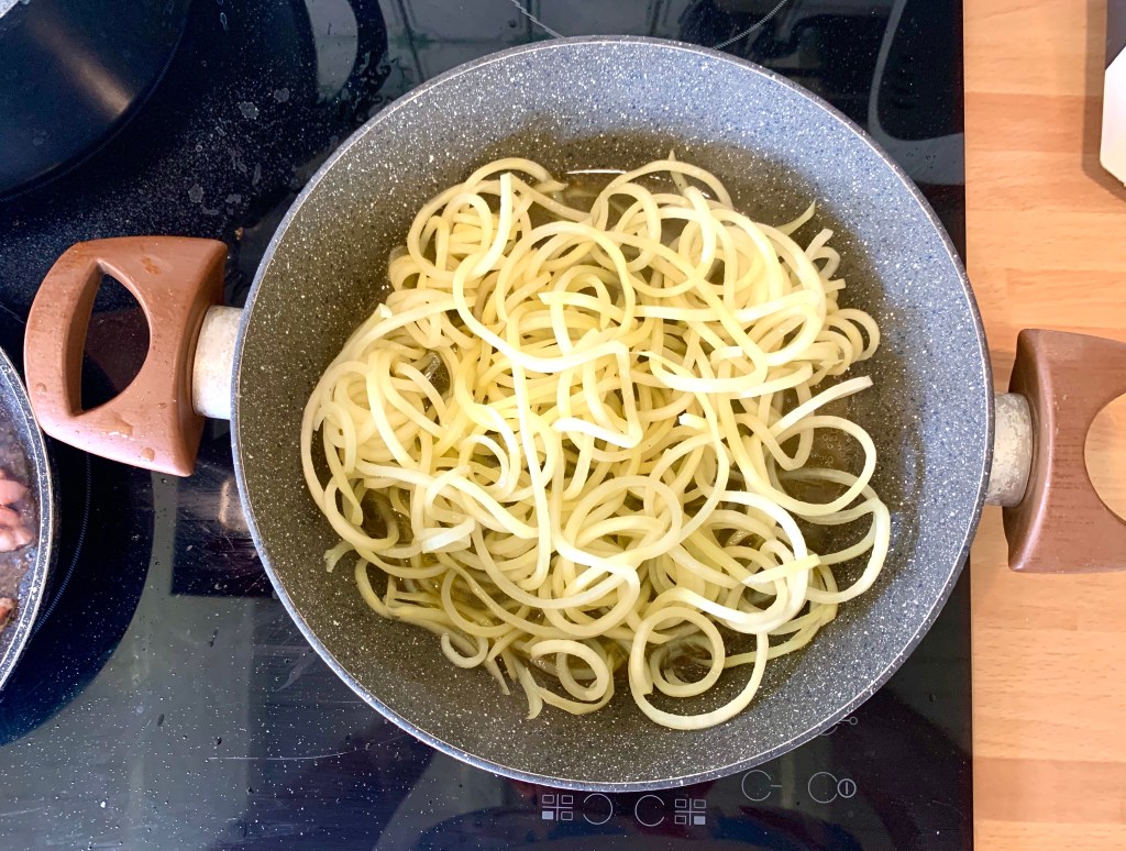 Ho versato gli spaghetti di patate nell’olio caldo, aromatizzato con il guanciale, facendoli leggermente soffriggere, poi ho aggiunto un mestolo di acqua calda salata alla volta, fino all’assorbimento dalle patate e ad ultimare la cottura in circa 8/10 minuti.