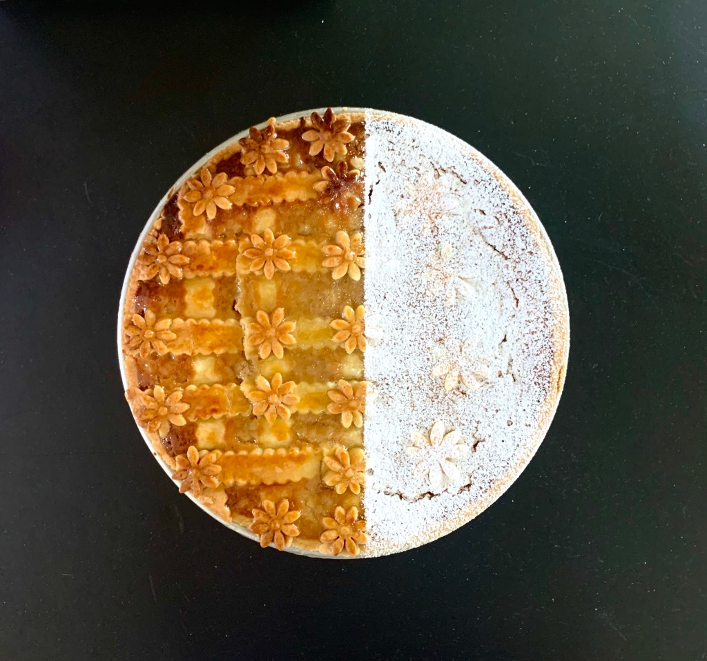 Ho poi spennellato della gelatina all’albicocca sulla parte decorata, mentre ho spolverato con dello zucchero a velo la parte del ripieno a vista.