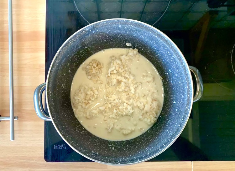 Per il Ripieno: Prendi il grano cotto, fallo rinvenire 10 minuti in un pentolino con latte e lascialo raffreddare.