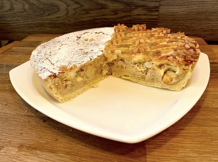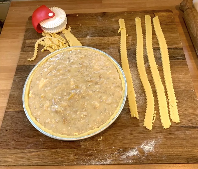 Stendi la pasta frolla alla semola in una forma per pastiera o da crostata e riempi l’incavo con il ripieno al grano