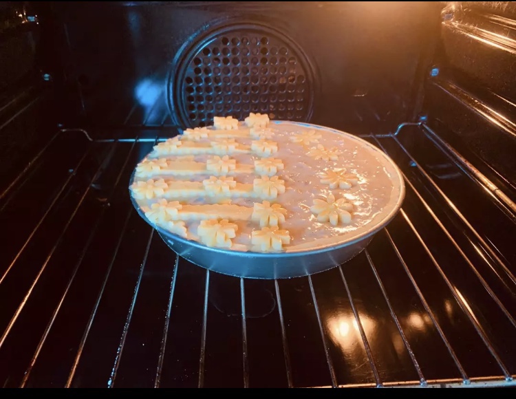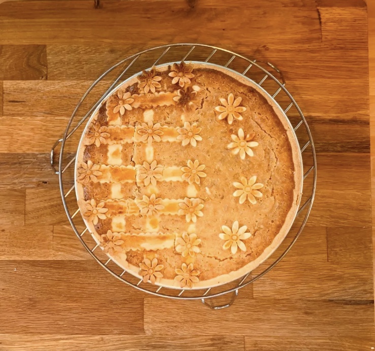 Decora la superficie della pastiera con strisce di pasta frolla larghe circa 1 centimetro, intrecciandole in modo da formare dei rombi, io l’ho decorata per metà con striscioline con dei fiorellini di pasta frolla