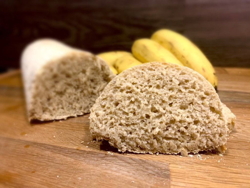 Questo pane alla banana con avena è leggermente dolce ed è fatto con lievito biologico senza glutine.