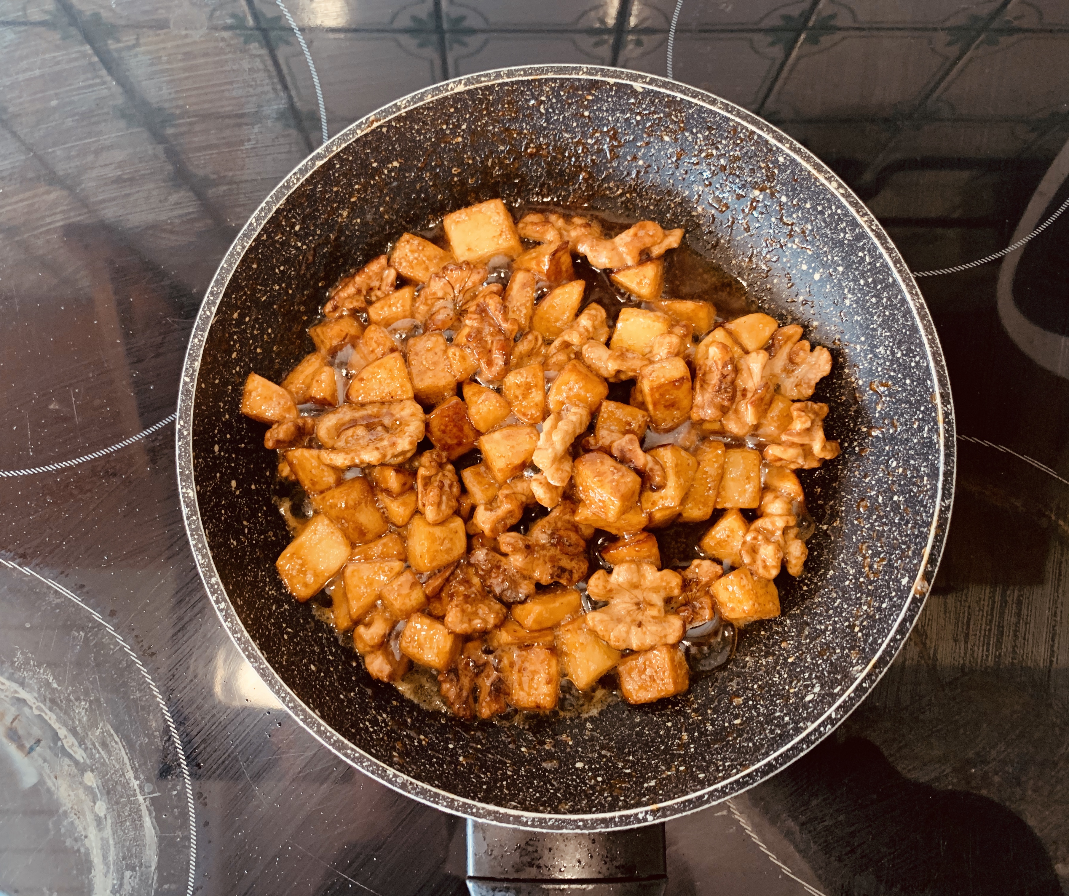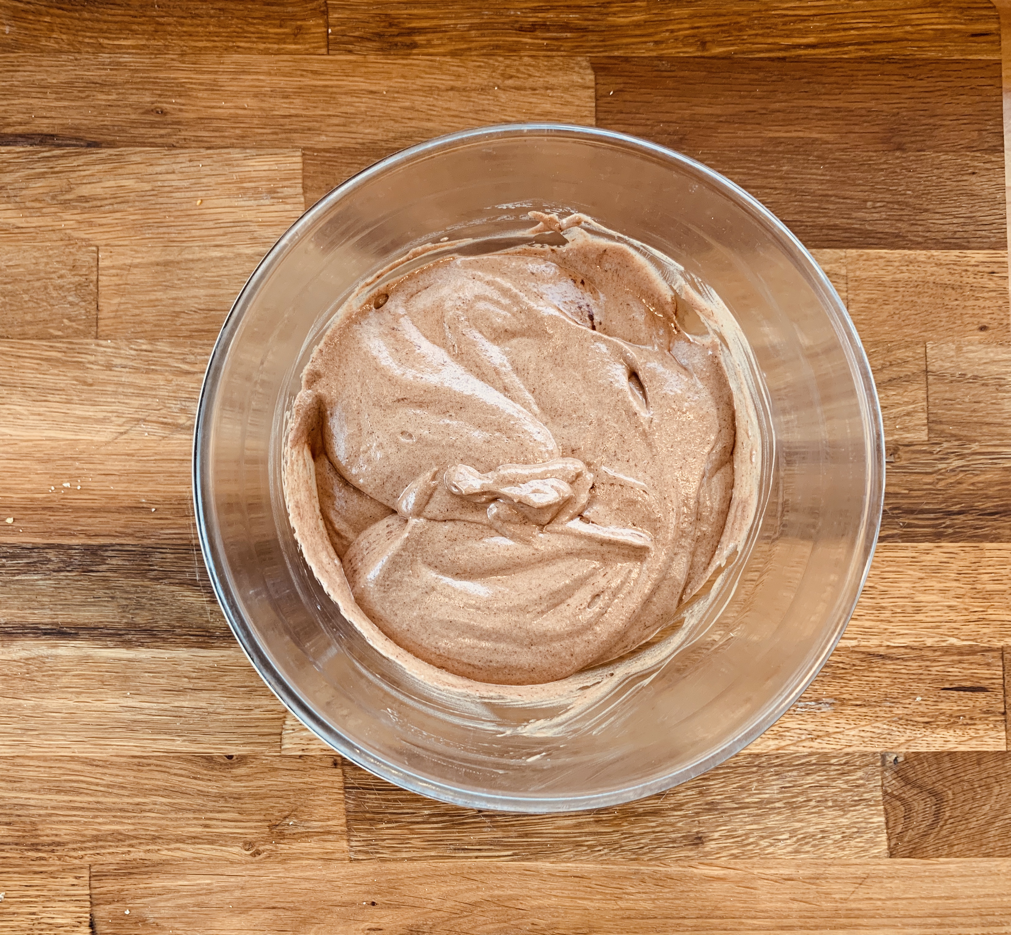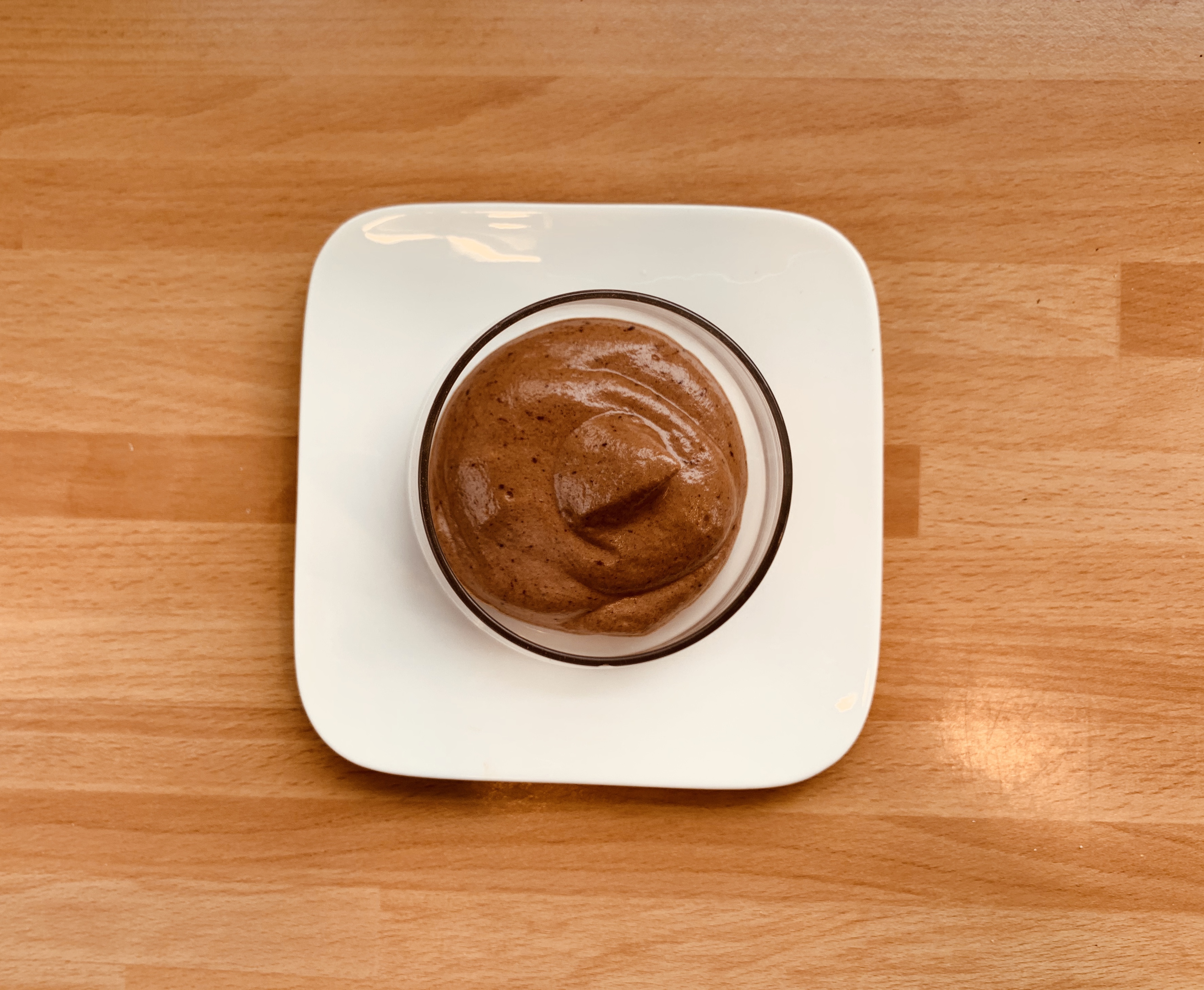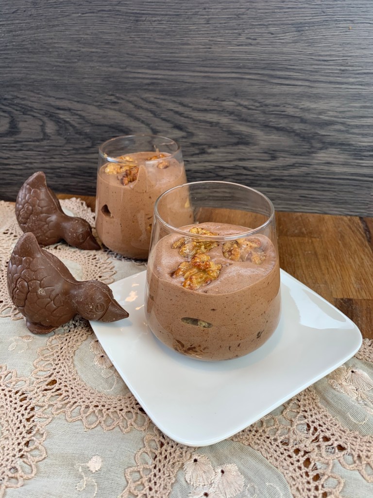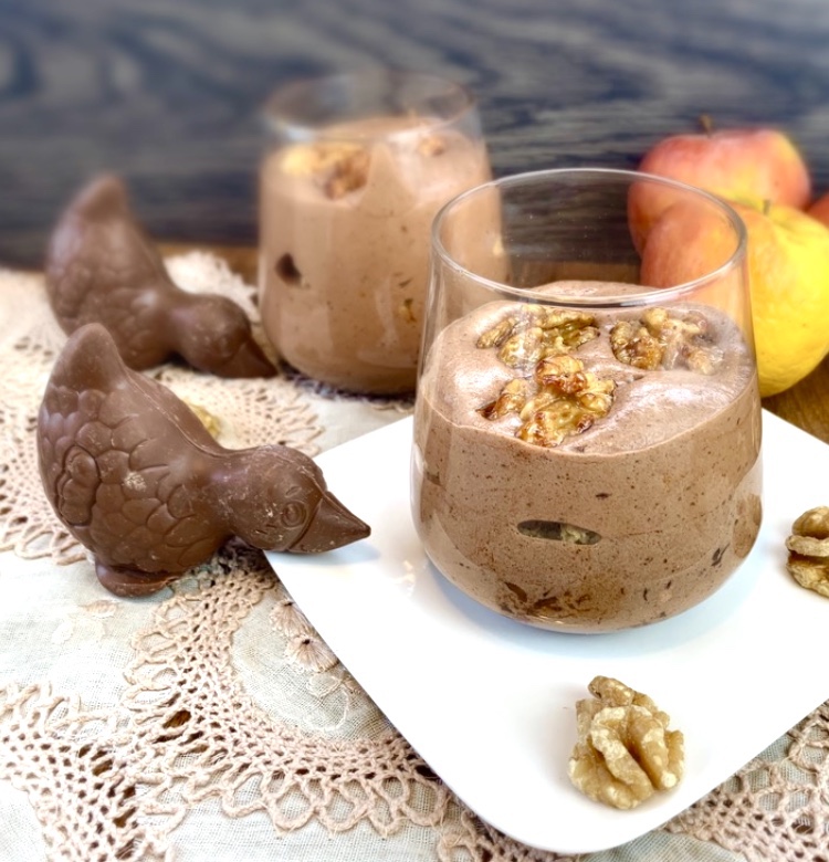 Una ricetta vegana e senza glutine preparata con l’acqua di conservazione dei ceci, o di altri legumi, l’Aquafaba, ho aggiunto del cioccolato fondente sciolto, pezzetti dei miei biscotti di mais e delle mele caramellate con gherigli di noci.