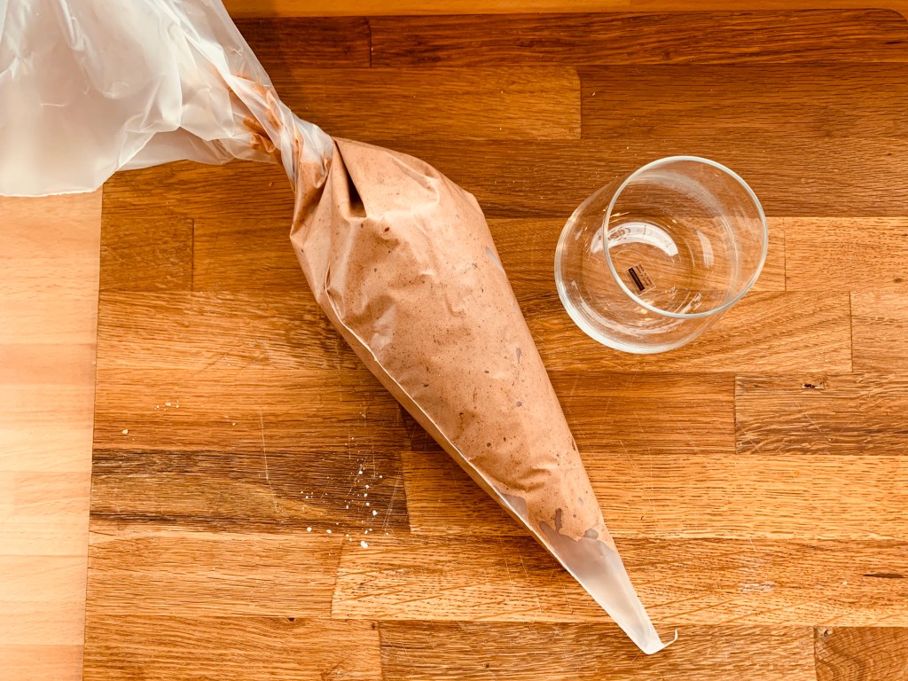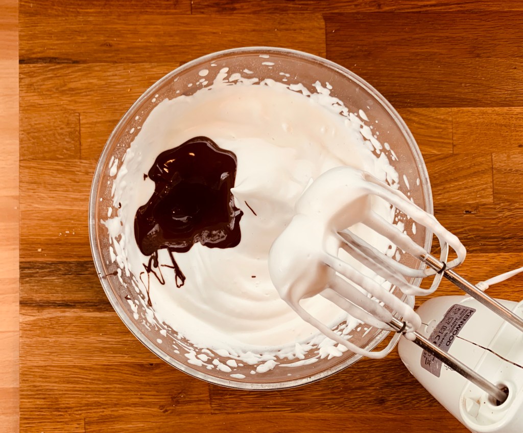 Unire alla meringa di Aquafaba il cioccolato sciolto delicatamente con una spatola di gomma e riempire un sac a poche