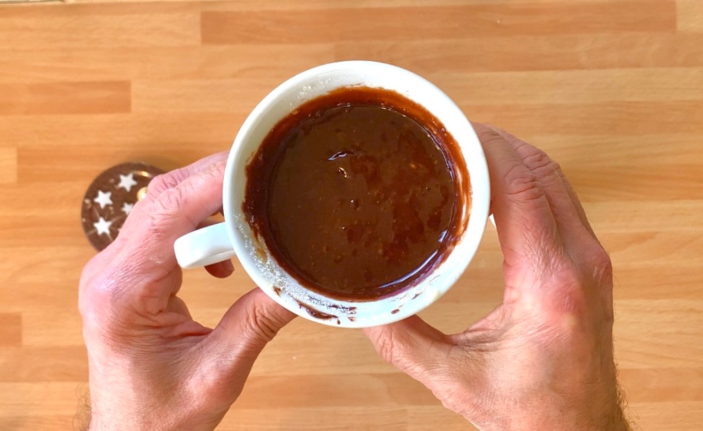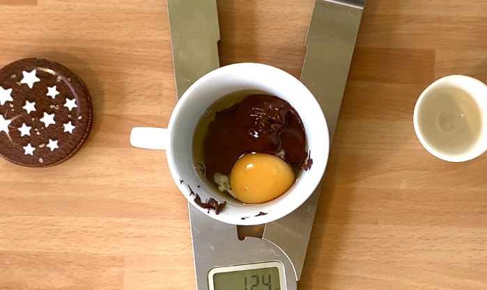 In una tazza da 250 ml versare la crema di nocciole e l’uovo poi mescolare con una forchetta