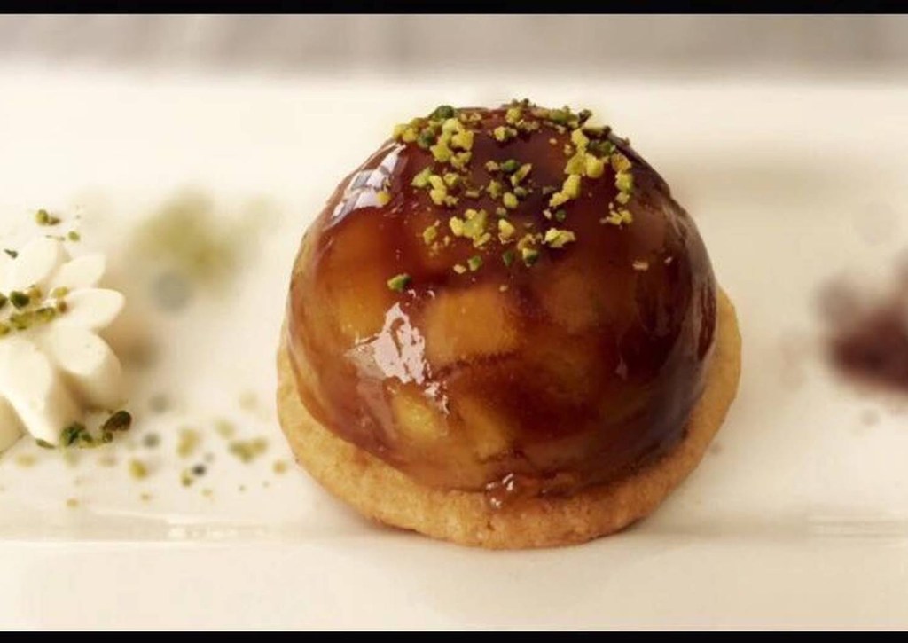 La sfera di mele caramellate sono state appoggiate su un disco di frolla bretone al rosmarino e servita con un ciuffo di panna montata.