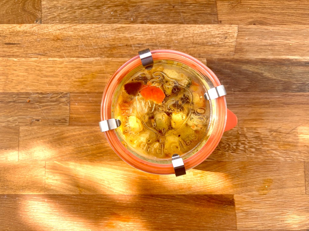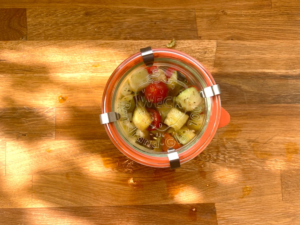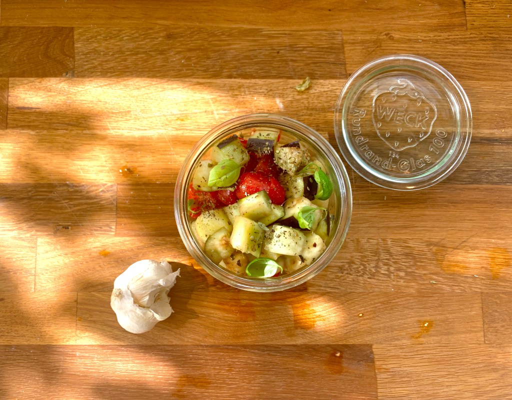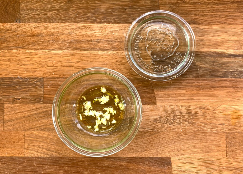 In un vasetto weck da 500 ml versare il cucchiaio di olio evo e lo spicchio d’aglio poi passarlo al microonde senza tappo per 1 minuto