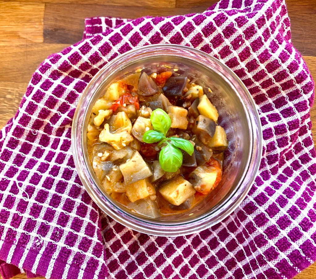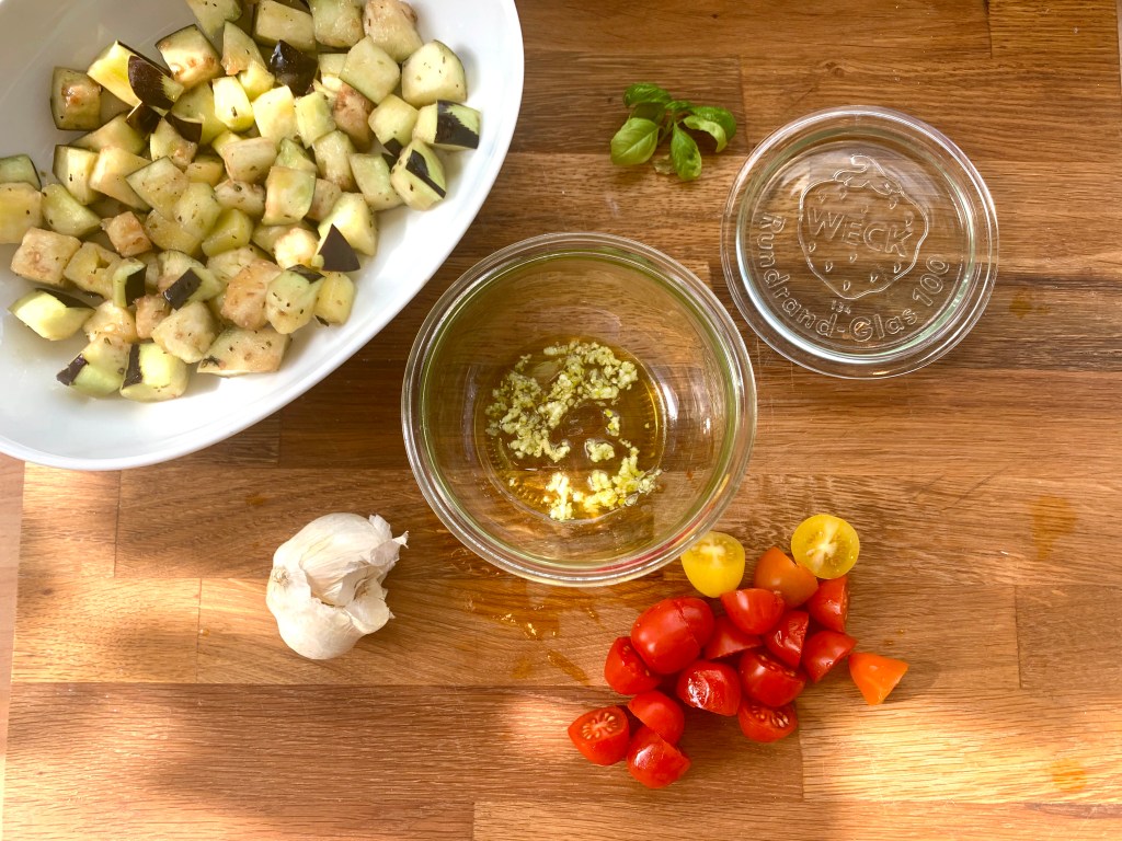 Aggiungere la melanzana lavata e tagliata a cubotti, unire i pomodorini tagliati a metà, il sale, l’origano e il basilico, mescolare il tutto