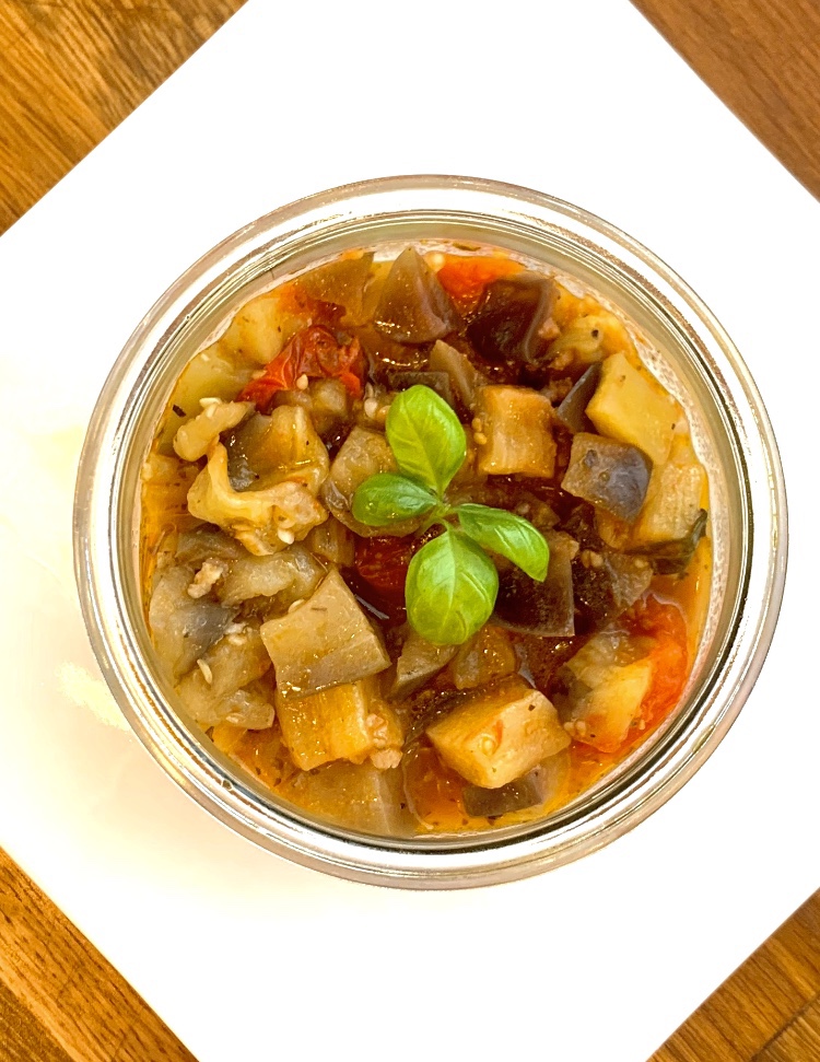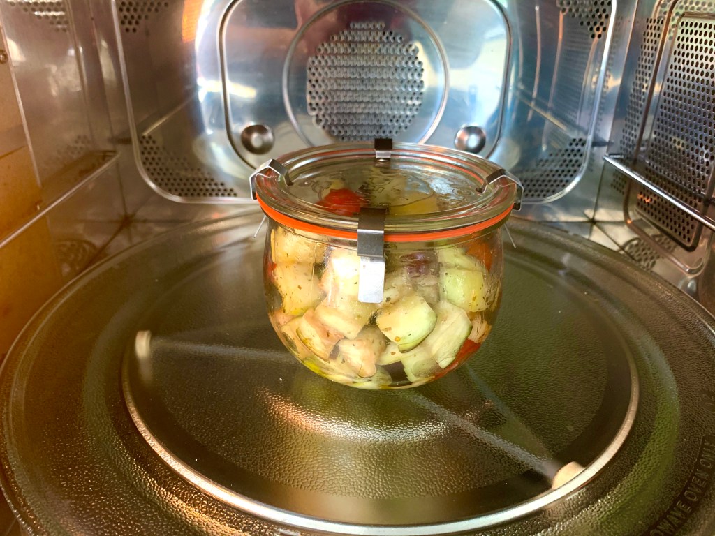 Far riposare il vasetto per 20 minuti su una gratella, nel frattempo completerà la cottura e si formerà il sottovuoto che permetterà di conservare la pietanza fino ad una settimana in frigorifero, basterà poi rimuovere i gancetti e rimettere il vasetto nel microonde per 2/3 minuti a 750 watt per degustare in tutta la sua fraganza le melanzane a funghetto.