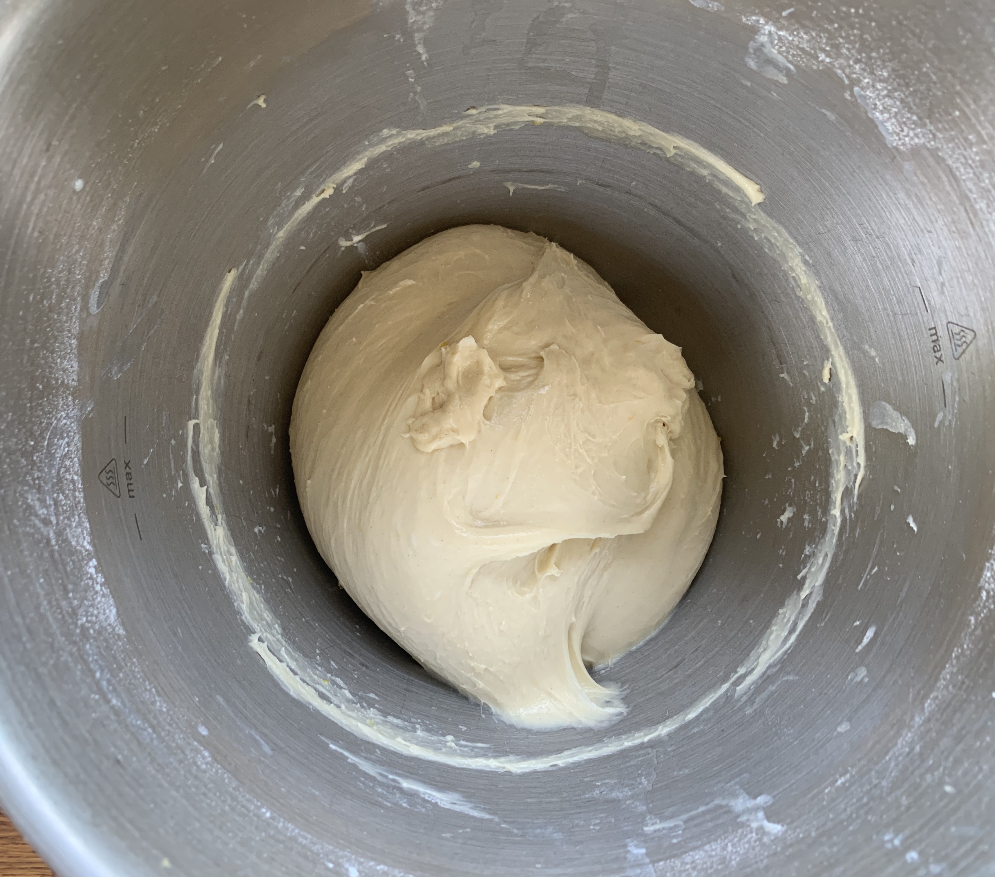 In una ciotola di una planetaria versare la farina, il lievito e lo zucchero e mescolare per integrare le polveri,