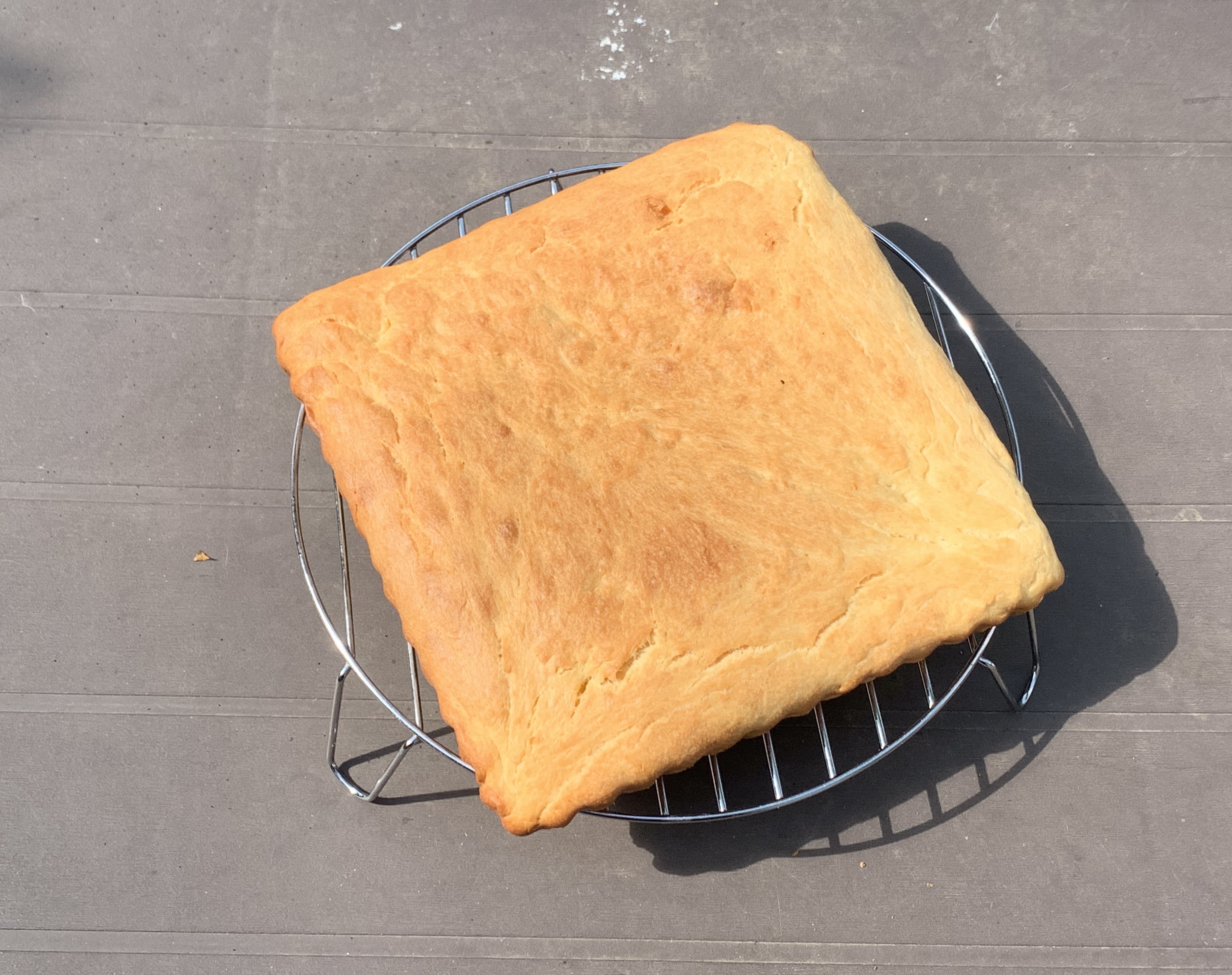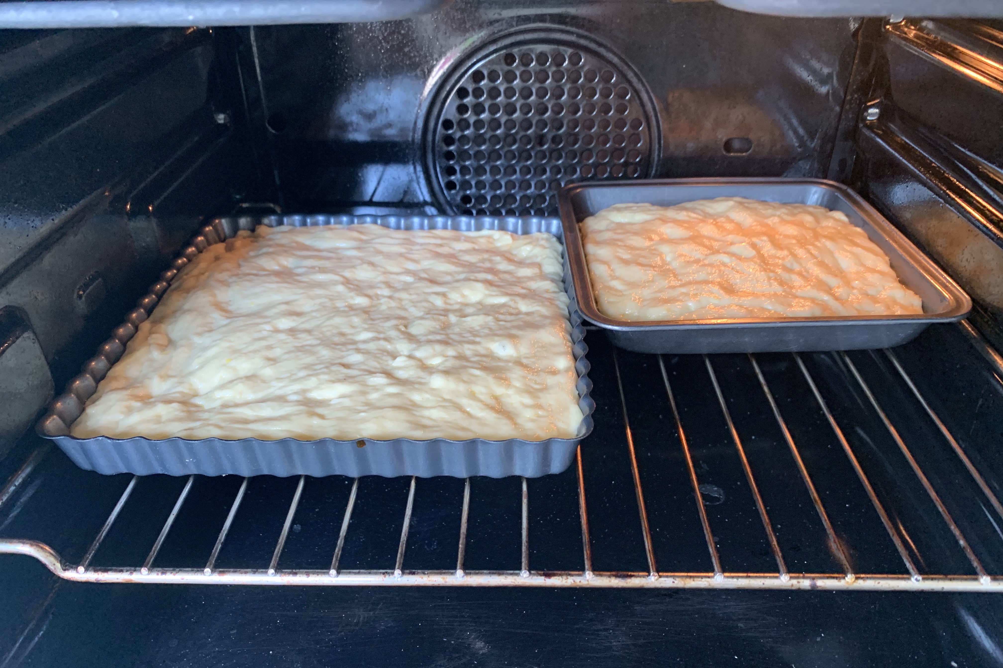 Ungere due teglie quadrate da 23×23 centimetri e 20×20 cm, o una unica rettangolare da 30×20 con un po’ di strutto o burro, stendere il composto nella teglia e fallo riposare per un’altra ora nel forno microonde spento con una tazza di acqua calda.