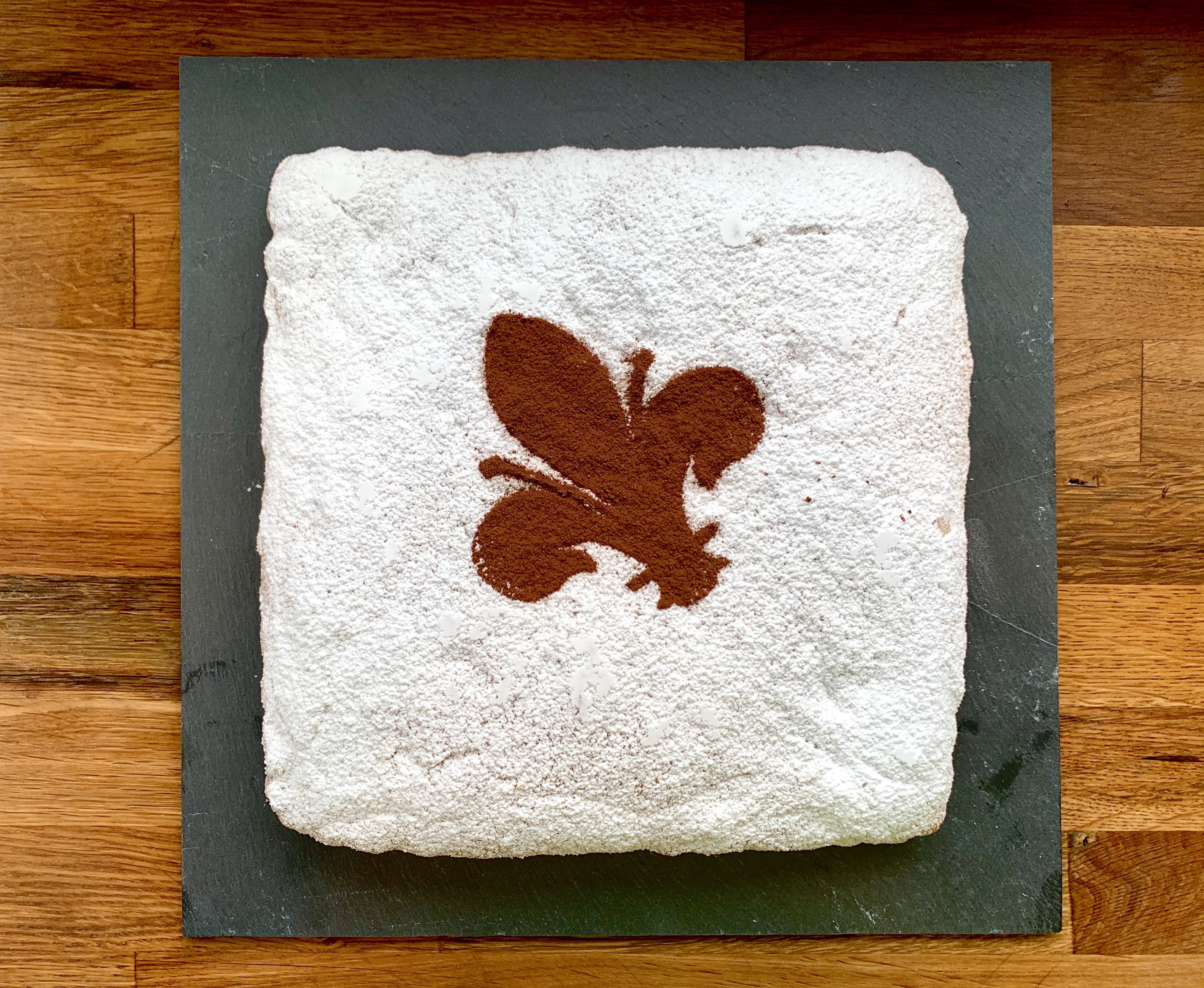 Finalizzata con una spolverata di zucchero a velo utilizzando un stencil di fiori