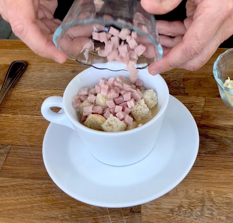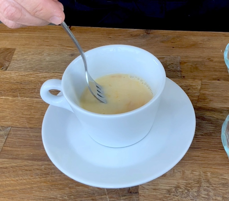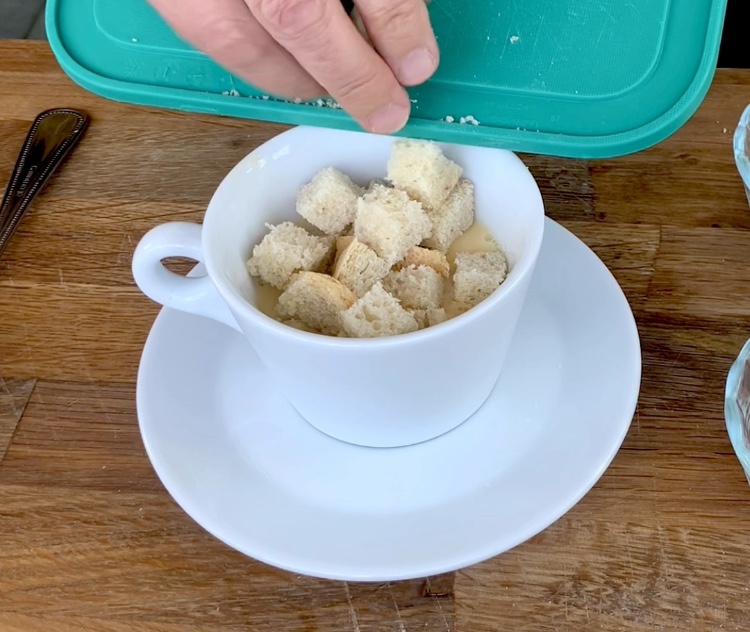 Lascia riposare per 5 minuti affinché il pane assorba la crema di latte e uova. Poi trasferisci la tazza al microonde per circa 2 minuti al massimo della potenza, verifica dopo 1 minuto e mezzo se la consistenza ottenuta é di tuo gradimento o completa la cottura prevista.