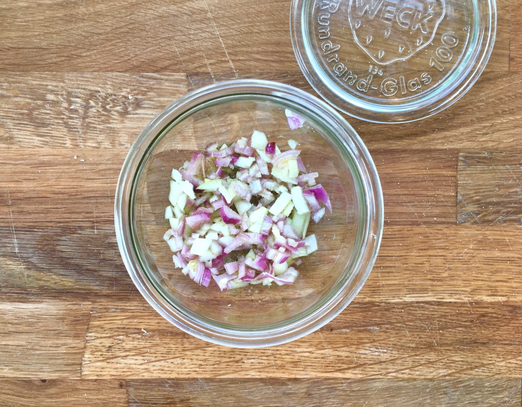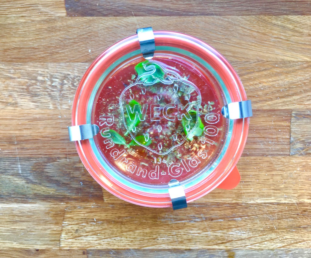 In un vasetto weck da 500 ml versare l’olio, lo scalogno e l’aglio tagliati a dadini