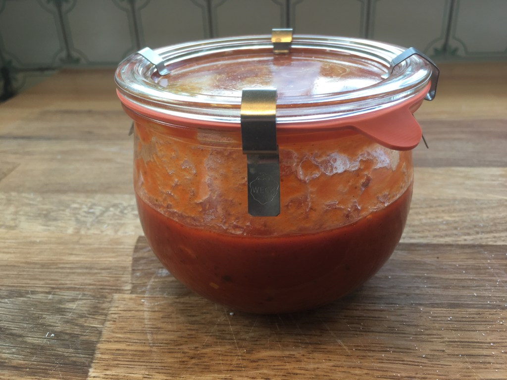 Aggiungere la polpa di pomodoro, il sale e gli odori, mescolare bene, pulire i bordi, chiudere con il tappo, guarnizione e 4 gancetti