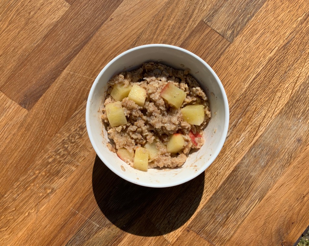 Avena, mele, cannella, poco zucchero, qualche goccia di latte vegetale e un filo di miele per cominciare la giornata a tutto gas.