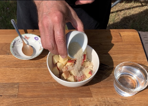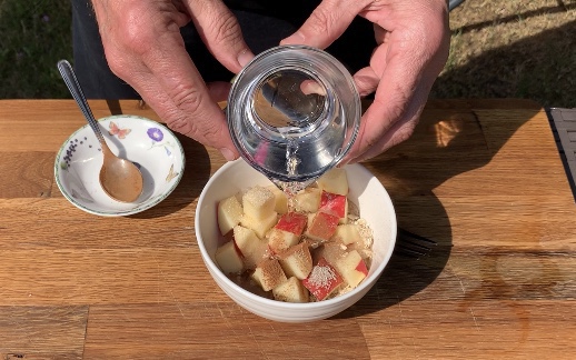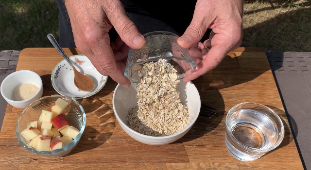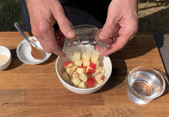 In una tazza per microonde da 200 ml versare l’avena, i cubetti di mela, la cannella