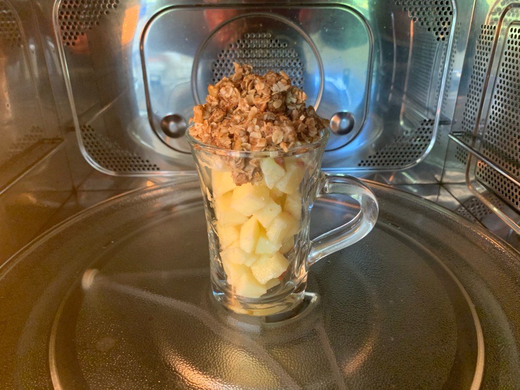 Per preparare questa mug cake basta tagliare la mela aggiungere un po’ di cannella e farina, completo la preparazione con un delizioso crumble croccante fatto di avena, noci, burro e zucchero. Non crederesti a cosa fanno questi semplici ingredienti quando vengono scaldati al microonde per poco più di 2 minuti. I cubetti di mela si ammorbidiscono e il topping diventa croccante.