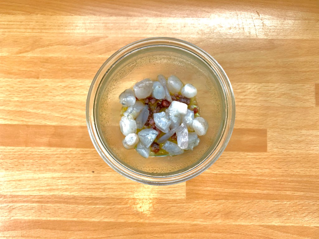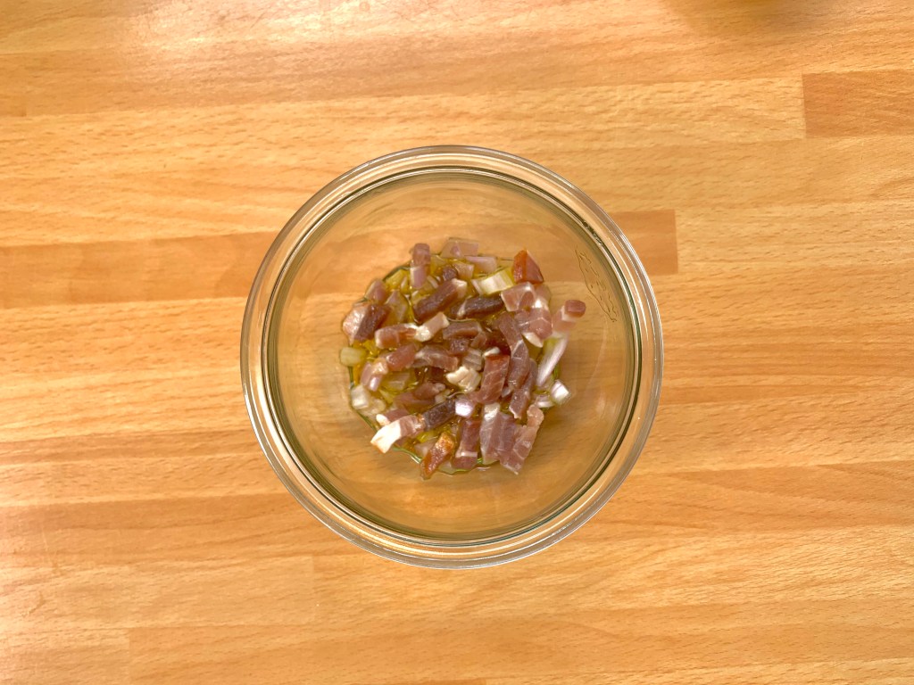 In un vasetto Weck da 500 ml ho unito lo scalogno a dadini, l’olio e la pancetta e ho fatto soffriggere il tutto nel Microonde senza tappo per 1 minuto e 30 secondi a 750 watt
