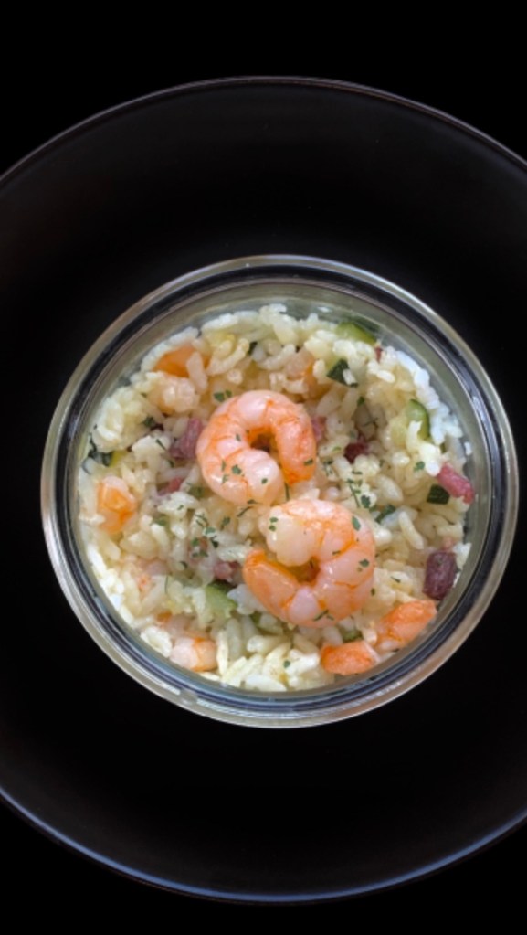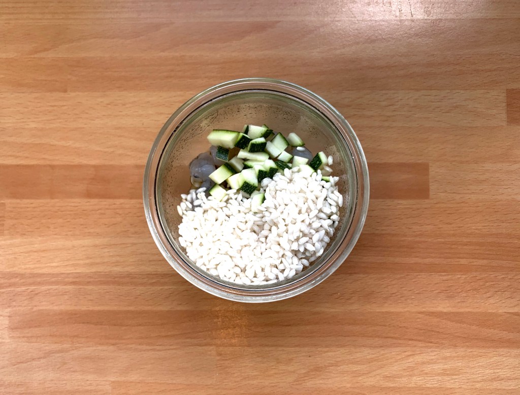 Delizioso e veloce il risotto con gamberi, pancetta e zucchine, pronto in 6 minuti in vasocottura al Microonde.