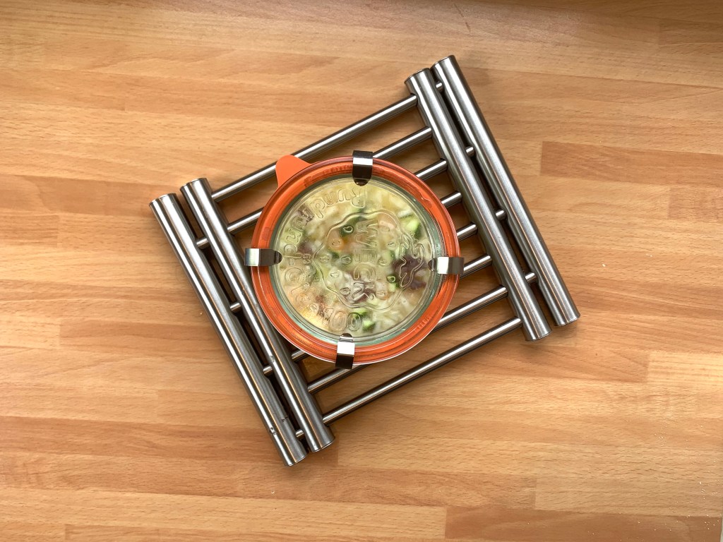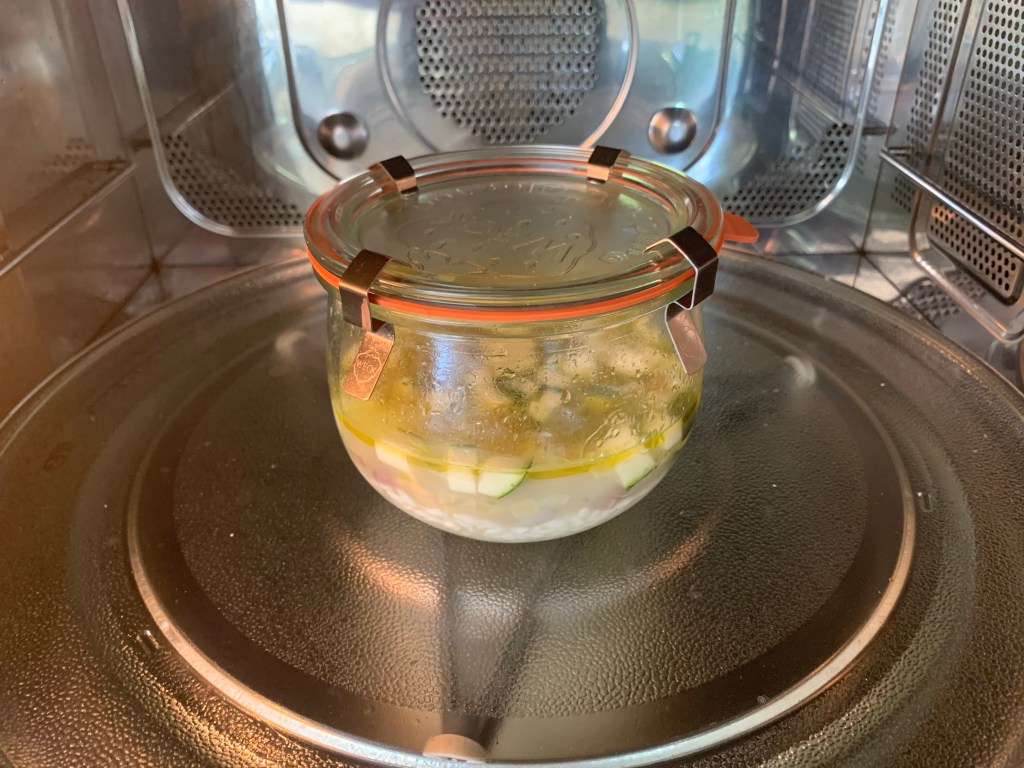 Un ricetta che si può preparare con antecedenza, poi conservato in frigo fino ad una settimana, pronto per il pranzo a lavoraro o per la cena, basta rimuovere i gancetti e rimettere il vasetto al Microonde per 2/3 minuti a 750 watt.