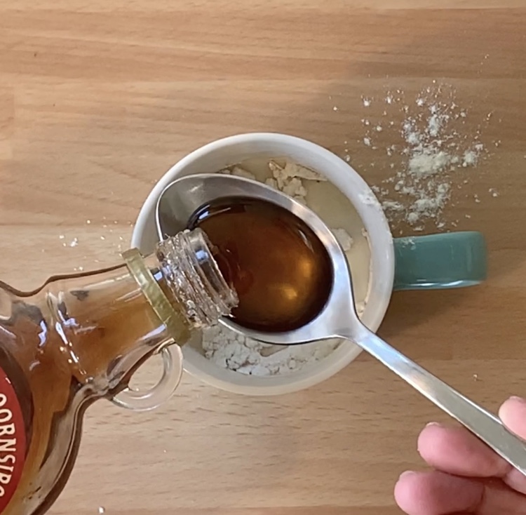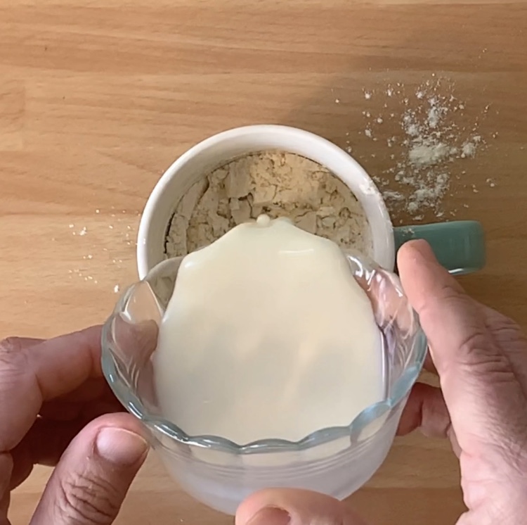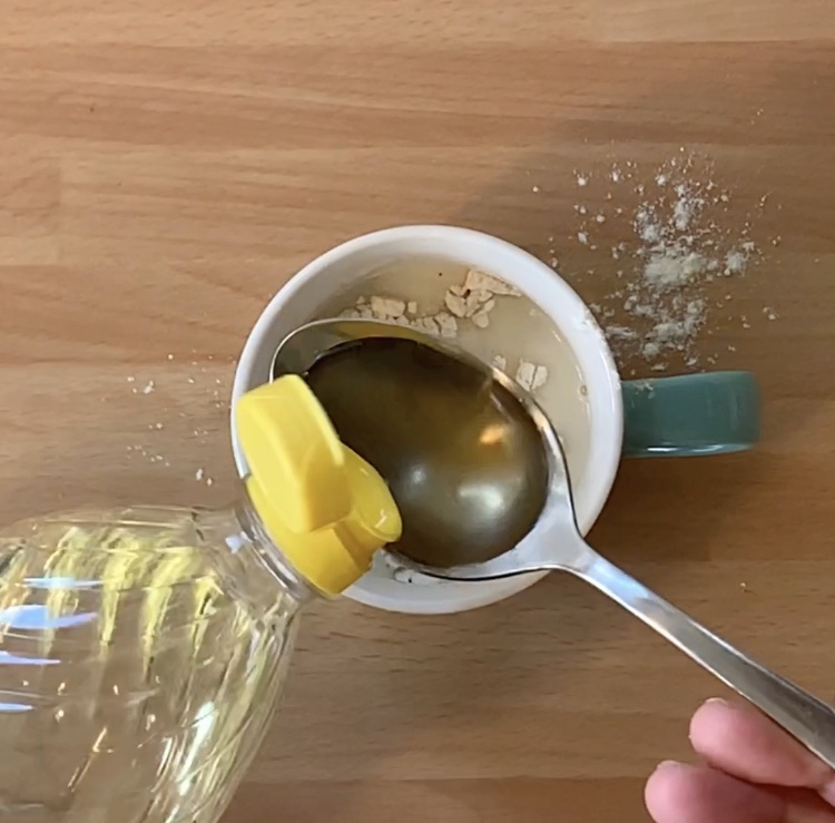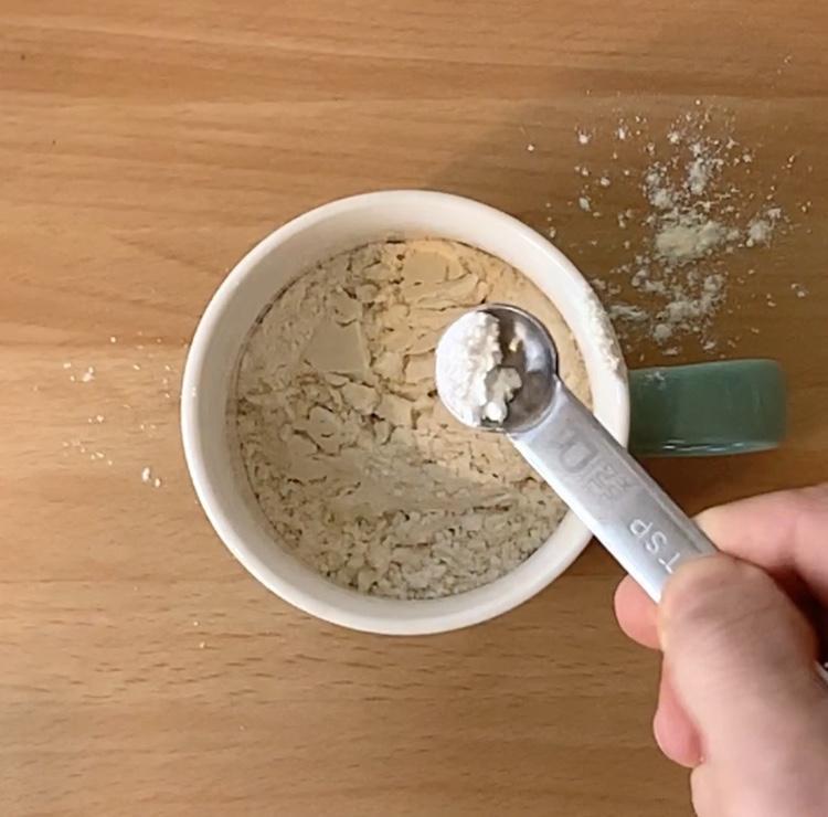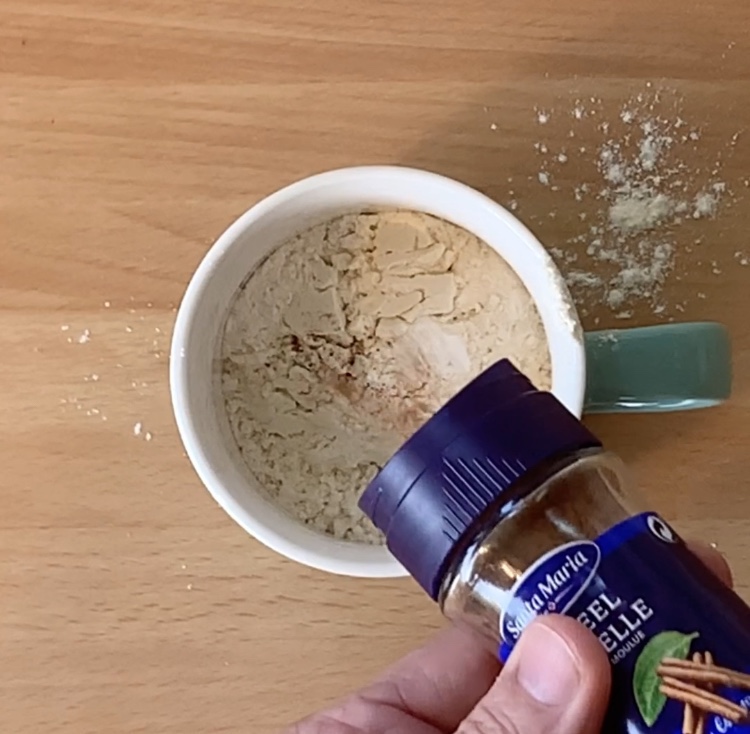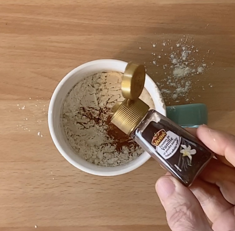 In una tazza da 200 ml adatta per microonde ho versato la farina, il lievito, il sale, la cannella e la vaniglia e ho mescolato le polveri con una forchetta