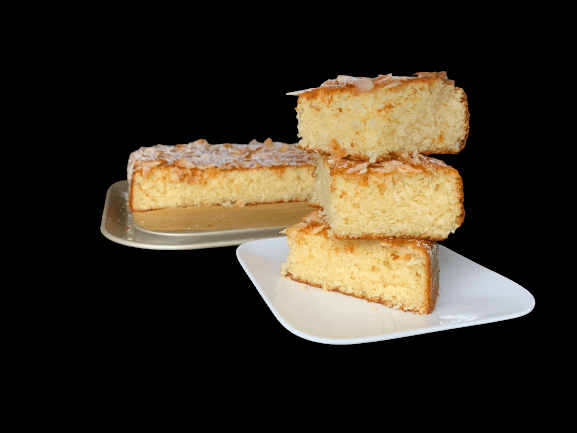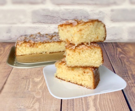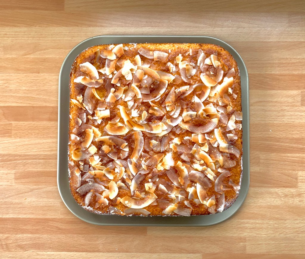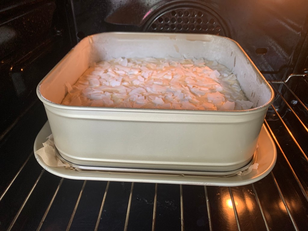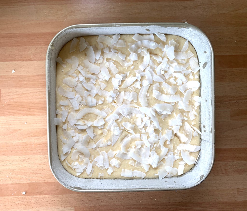 Amalgamare gli ingredienti e versare l’impasto in una forma quadrata imburrata, infarinata e con carta forno sul fondo, coprire la superficie con fiocchi di cocco essiccato e cuocere in forno statico preriscaldato a 180 gradi per circa 35 minuti