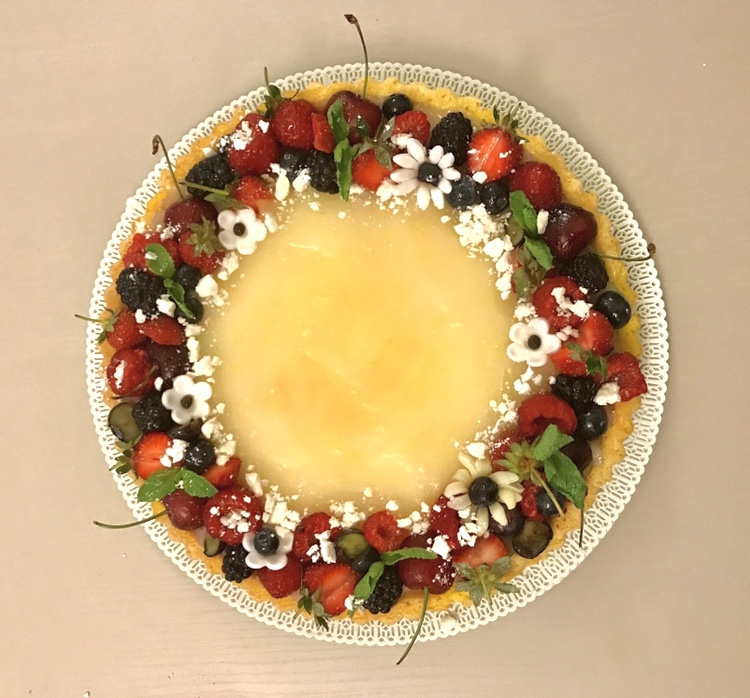 Una ricetta adattata per gli intolleranti al glutine e lattosio, una base di crostata morbida ripiena di una deliziosa crema al limone fatta semplicemente con acqua, amido di mais, zucchero e tanto limone. Poi super colorata con frutti rossi, qualche briciola di meringa e fiorellini di pasta di zucchero. Una Torta molto fresca e adatta per qualsiasi momento della giornata.